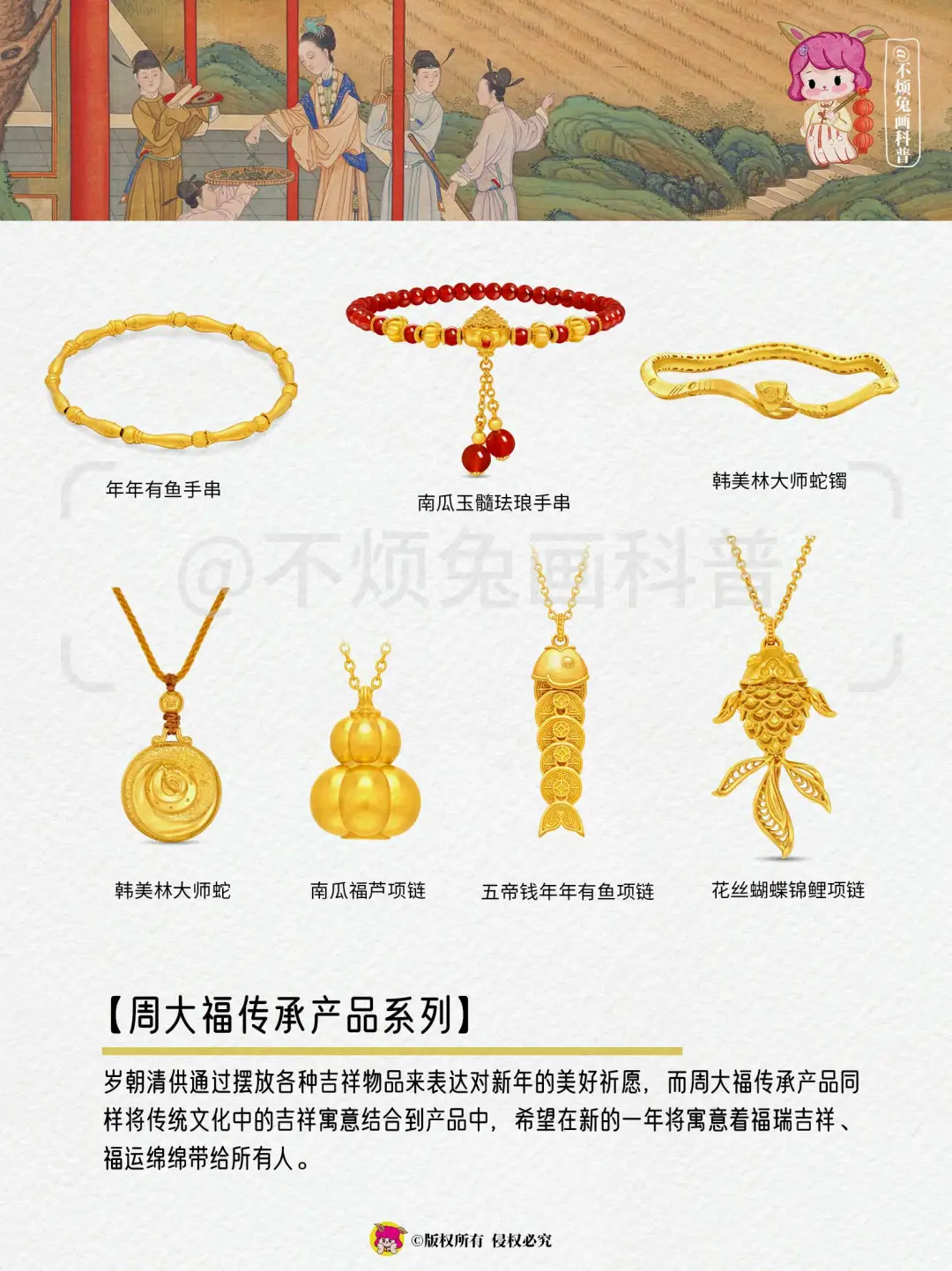 岁朝清供通过摆放各种吉祥物品来表达对新年的美好祈愿,而周大福传承产品同样将传统文化中的吉祥寓意结合到产品中,希望在新的一年将寓意着福瑞吉祥、福运绵绵带给所有人。