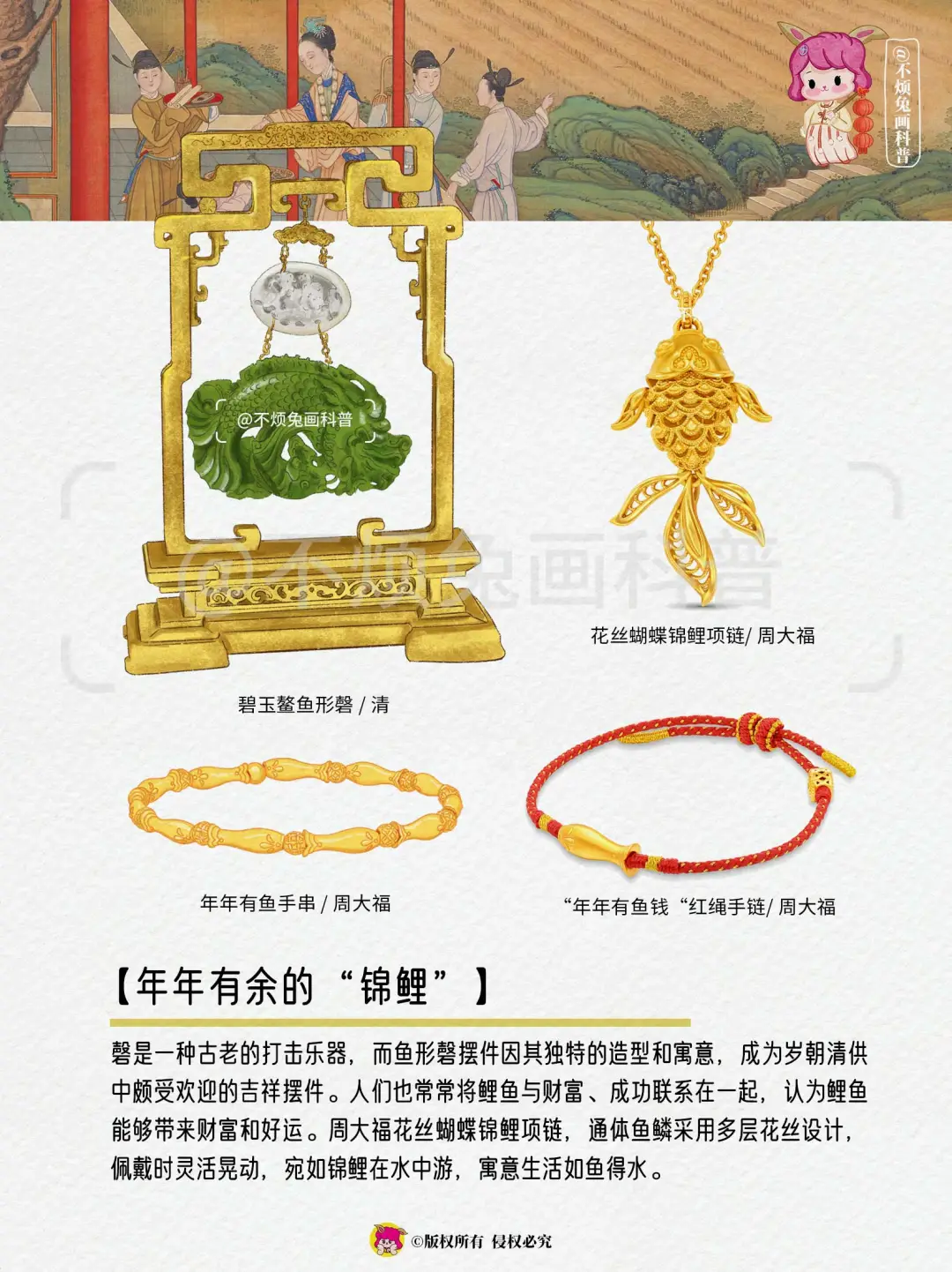 磬是一种古老的打击乐器,而鱼形磬摆件因其独特的造型和寓意,成为岁朝清供中颇受欢迎的吉祥摆件。人们也常常将鲤鱼与财富、成功联系在一起,认为鲤鱼能够带来财富和好运。周大福花丝蝴蝶锦鲤项链,通体鱼鳞采用多层花丝设计,佩戴时灵活晃动,宛如锦鲤在水中游,寓意生活如鱼得水。