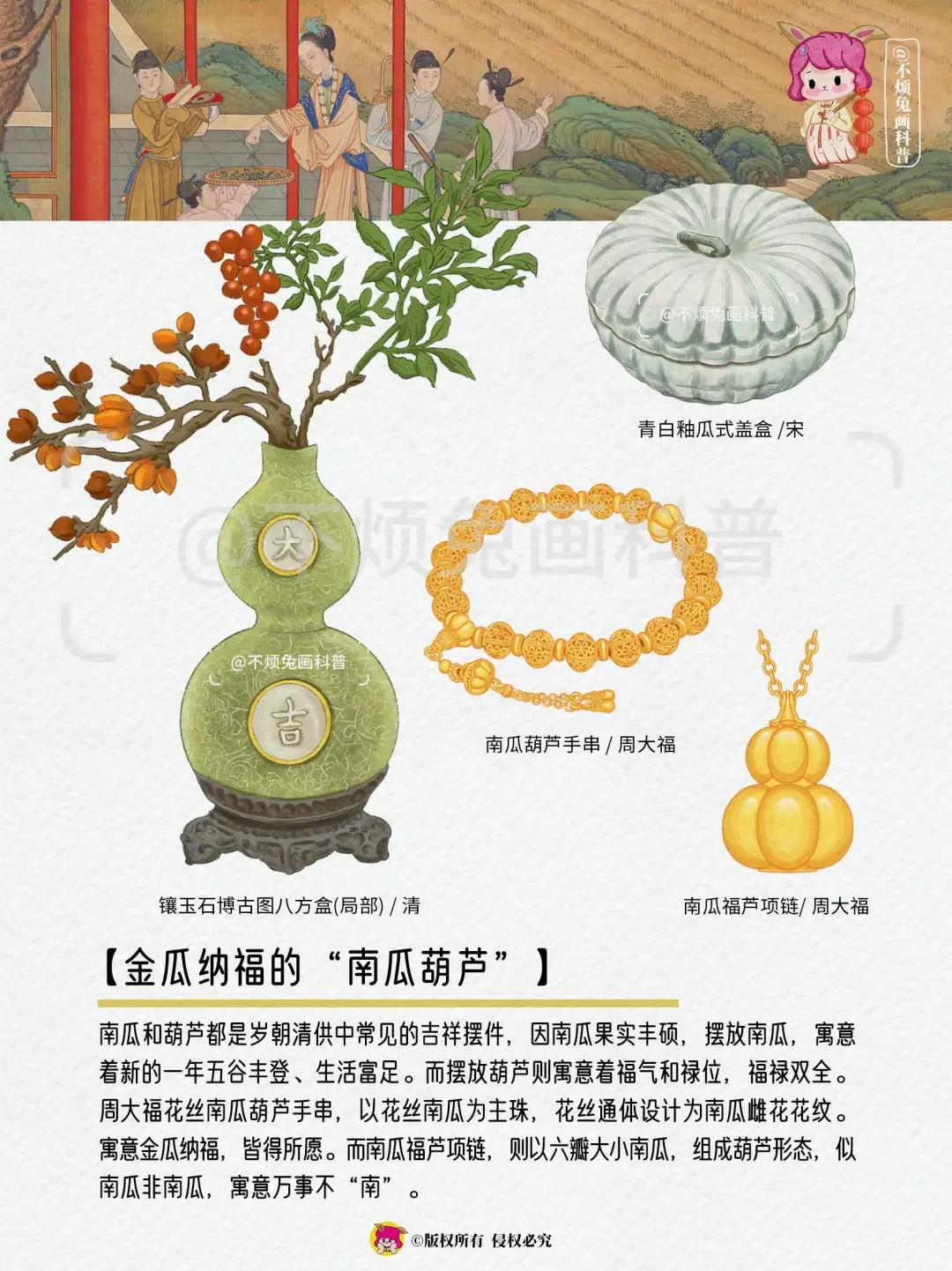 南瓜和葫芦都是岁朝清供中常见的吉祥摆件,因南瓜果实丰硕,摆放南瓜,寓意着新的一年五谷丰登、生活富足。而摆放葫芦则寓意着福气和禄位,福禄双全。周大福花丝南瓜葫芦手串,以花丝南瓜为主珠,花丝通体设计为南瓜雌花花纹。寓意金瓜纳福,皆得所愿。而南瓜福芦项链,则以六瓣大小南瓜,组成葫芦形态,似南瓜非南瓜,寓意万事不“南”。