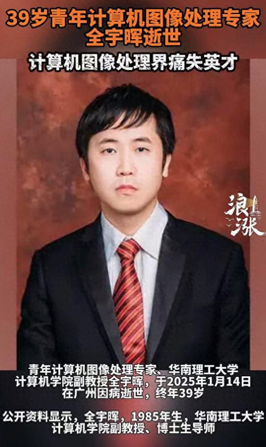 华南理工全宇晖副教授去世,年仅39岁。 近来高校一些专家教授先后不正常离去,应引起高层的重视,培养这些人才不容易,是国家的重大损失。 这么优秀的青年学科带头人专家,要知道健康是一,健康的活着,一切才有意义,愿您去了天堂,一切安好! 优秀是长期透支身体换来的!成功路上不能走的太急。愿逝者安息!