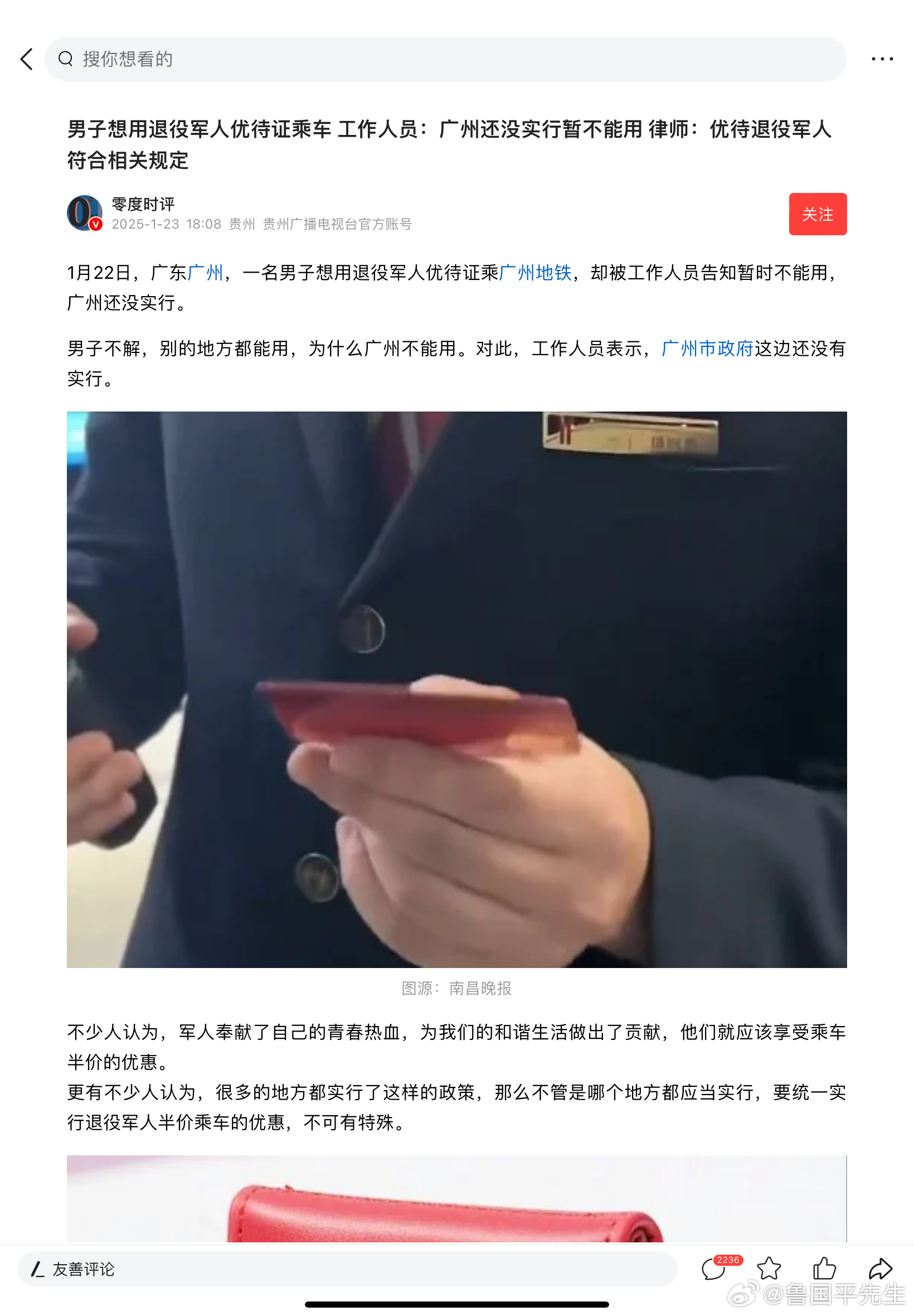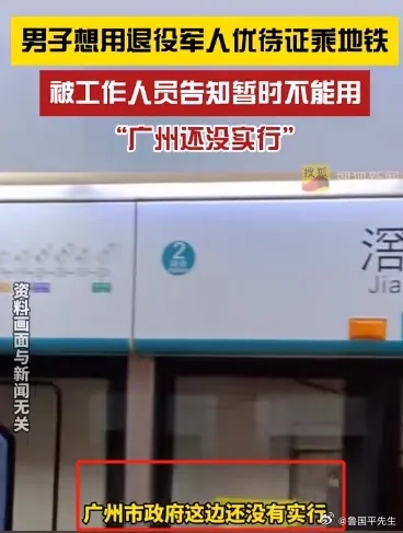 信源:零度时评(贵州广播电视台官方账号)--男子想用退役军人优待证乘车 工作人员:广州还没实行暂不能用 律师:优待退役军人符合相关规定