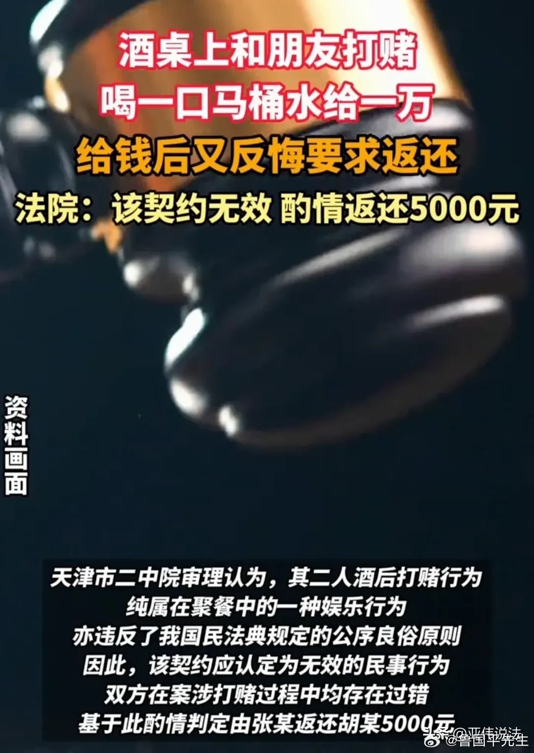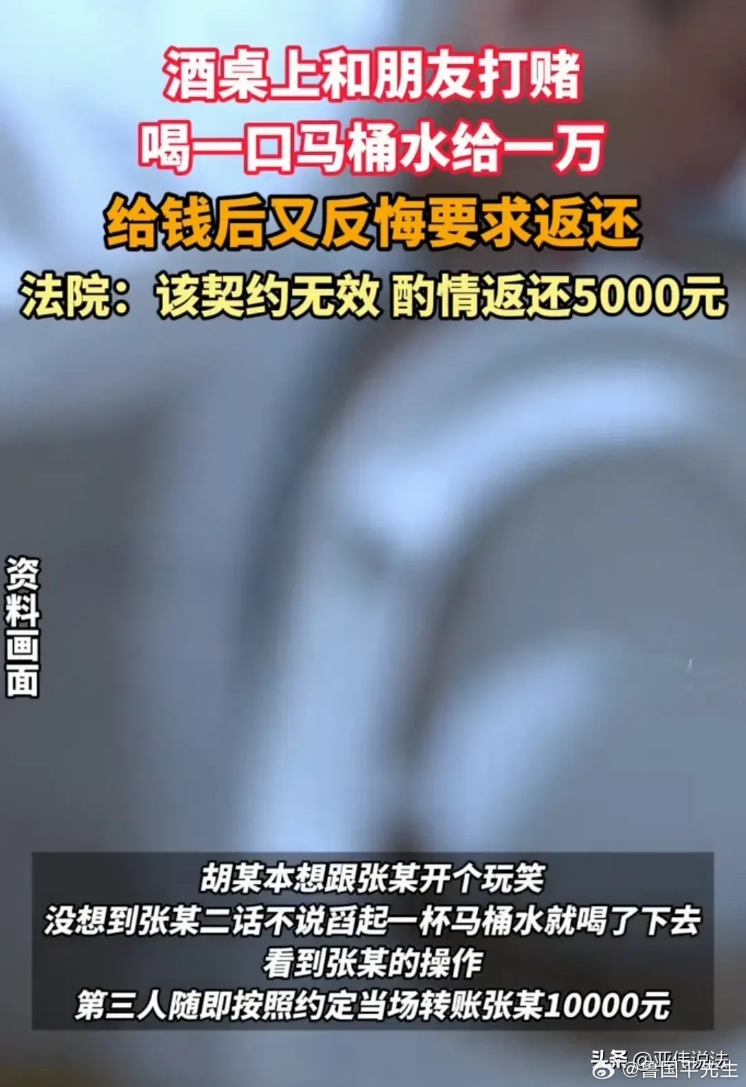 玩不起别玩!天津,男子参加酒局,同桌人称,如果他敢喝一口马桶水就给他1万块,为了证明自己说话算数,还将1万块钱转账给第三人作证,表示愿赌服输。男子二话不说,滔了一杯马桶水喝下,证人将钱转给男子。半年后,打赌的人反悔想把钱要回去,被男子拒绝。他告上法庭,要求男子返还一万元不当得利,法庭判决令人意外!