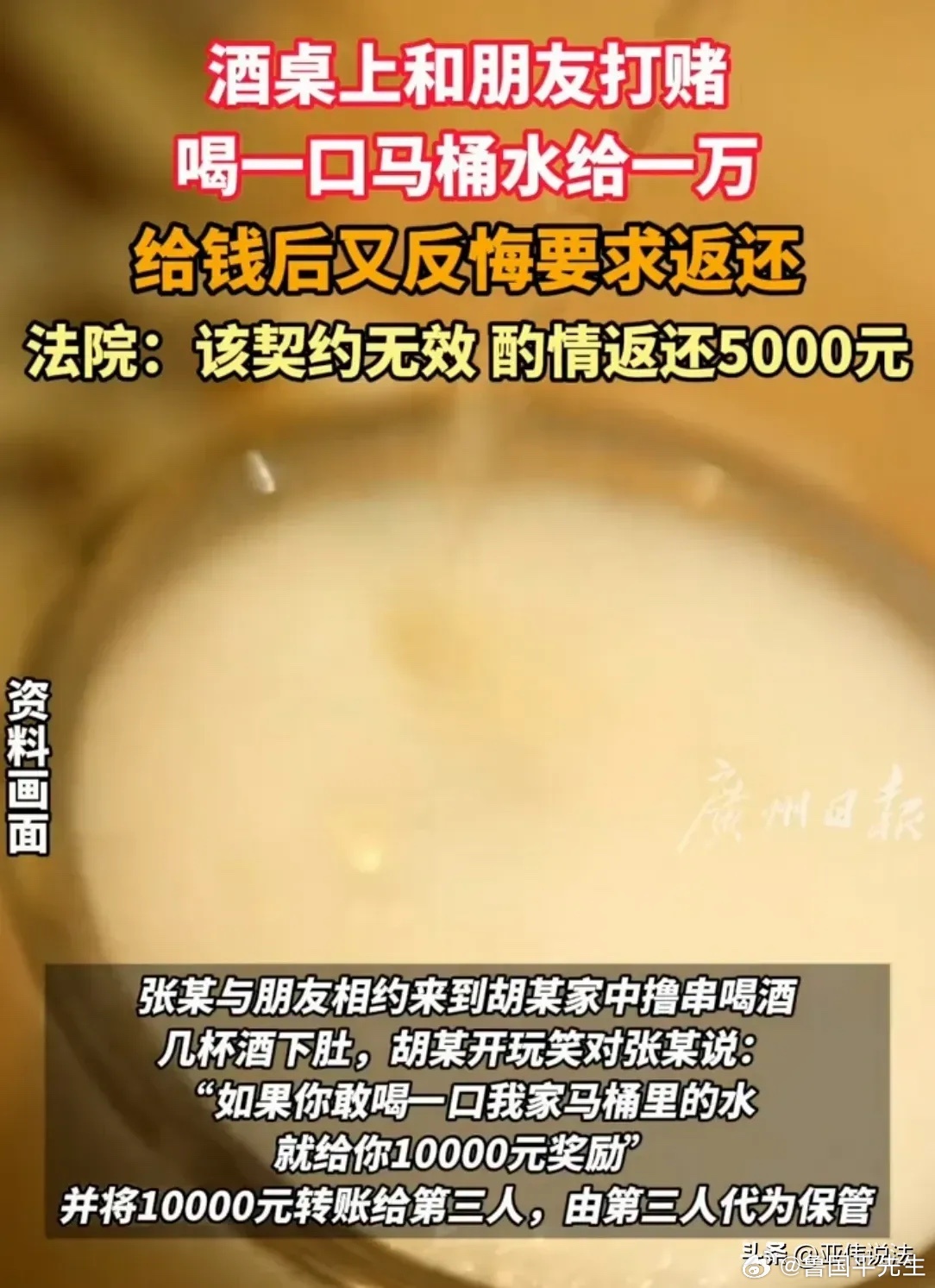 信源:潇湘晨报•晨视频—2025-1-25《酒桌上打赌喝口马桶水给1万,朋友真喝了对方反悔》