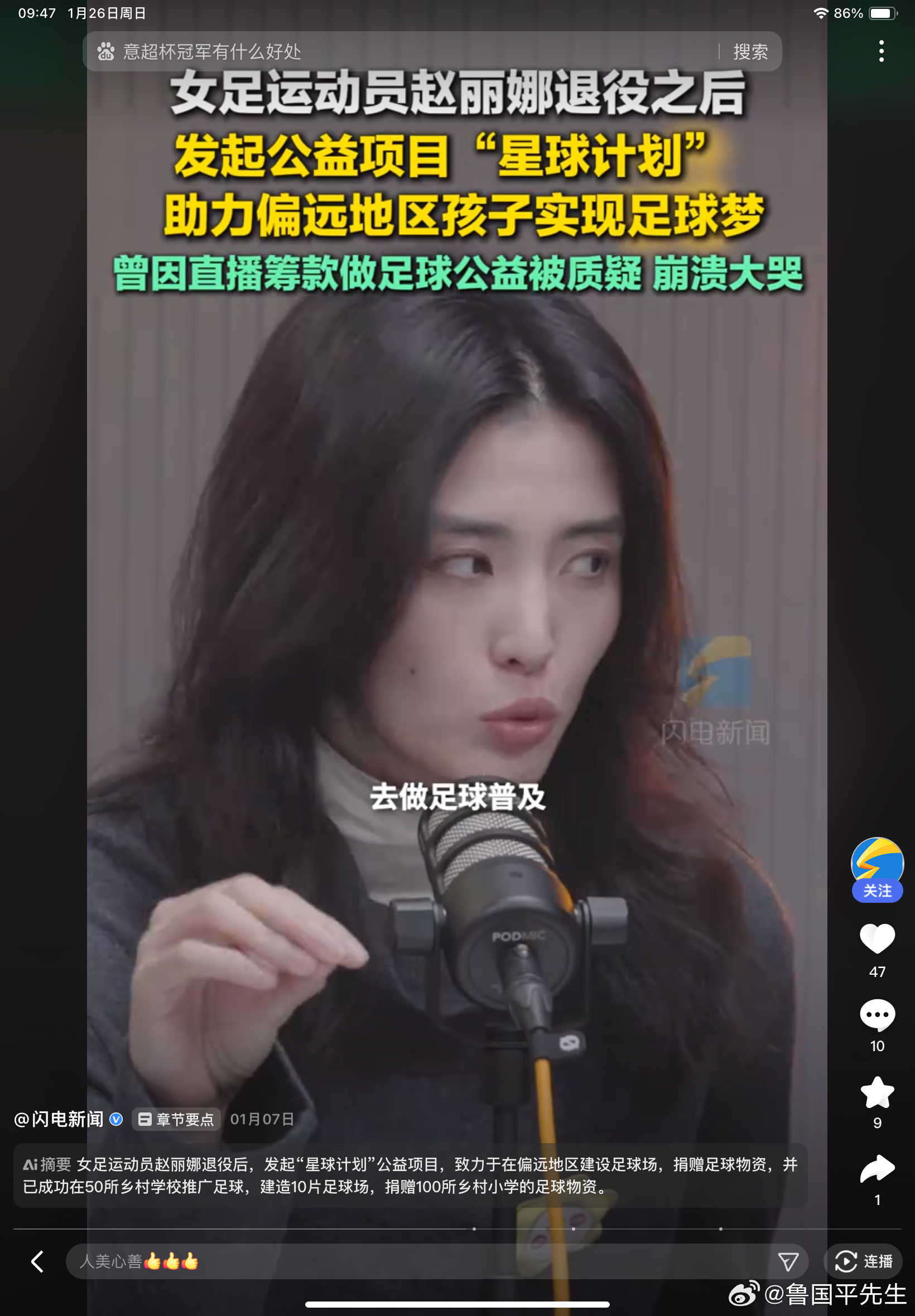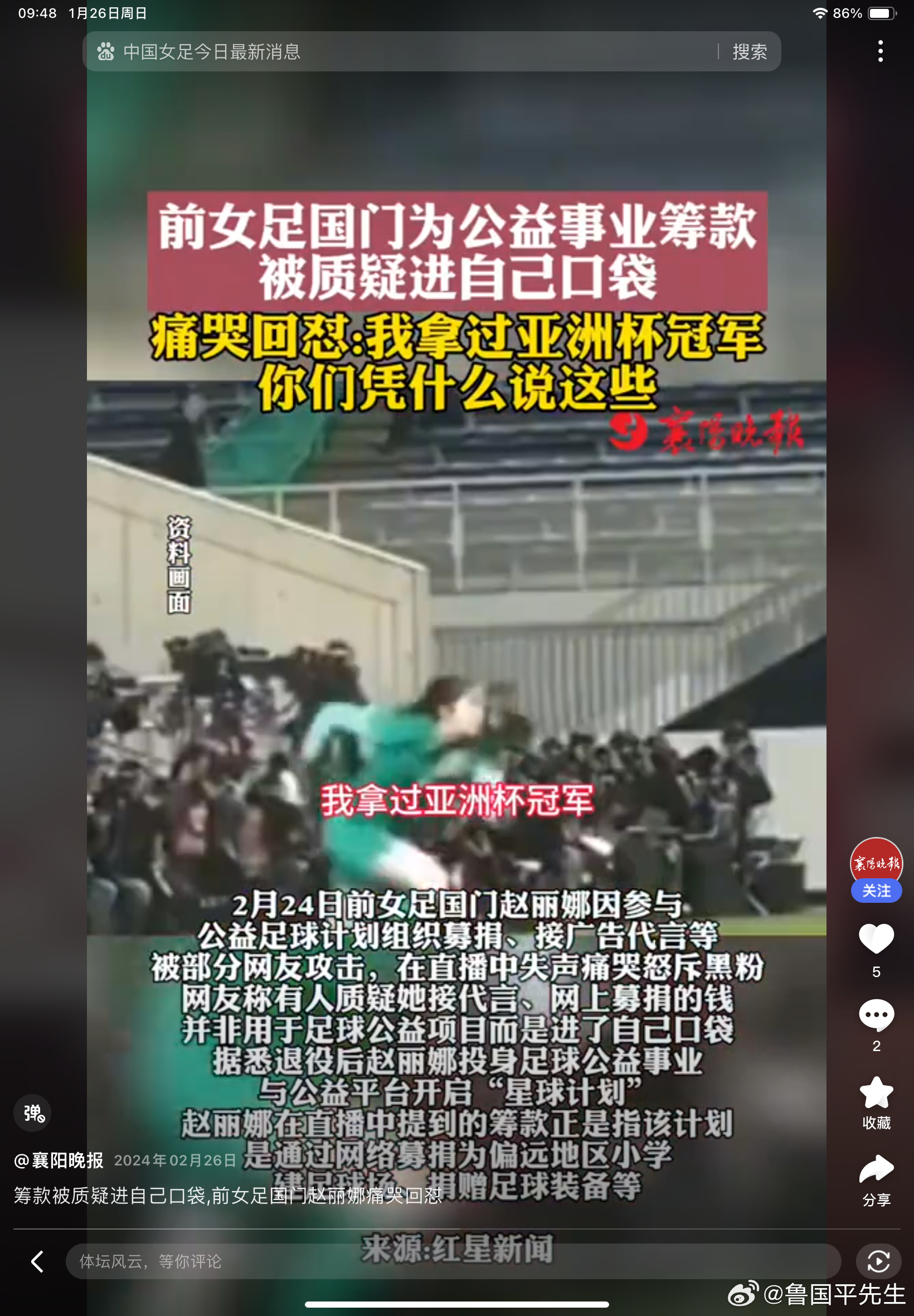 其实去年就有新闻出来说,前女足门将赵丽娜在网络进行直播,接了代言合同准备筹款做公益事业,为边远地区的学校捐球场、足球装备,结果呢,直播过程中被许多人质疑,各种阴谋论出炉了,说是赵丽娜募捐是骗钱进了自己的口袋。