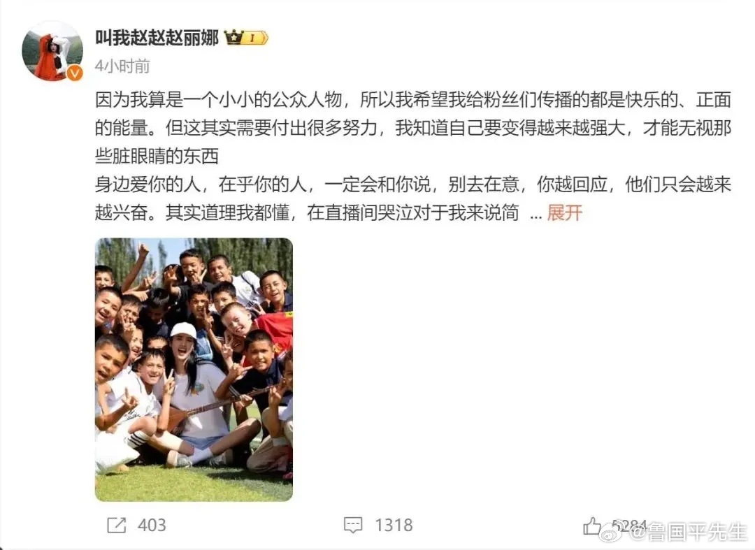 这让赵丽娜情绪失控,在直播时被气哭了,直接喊“你们凭什么说这些话?”赵丽娜之后还专门在社交媒体发了长文进行回应:“因为我算是一个小小的公众人物,所以我希望我给粉丝们传播的都是快乐的、正面的能量。但这其实需要付出很多努力,我知道自己要变得越来越强大,才能无视那些脏眼睛的东西。”