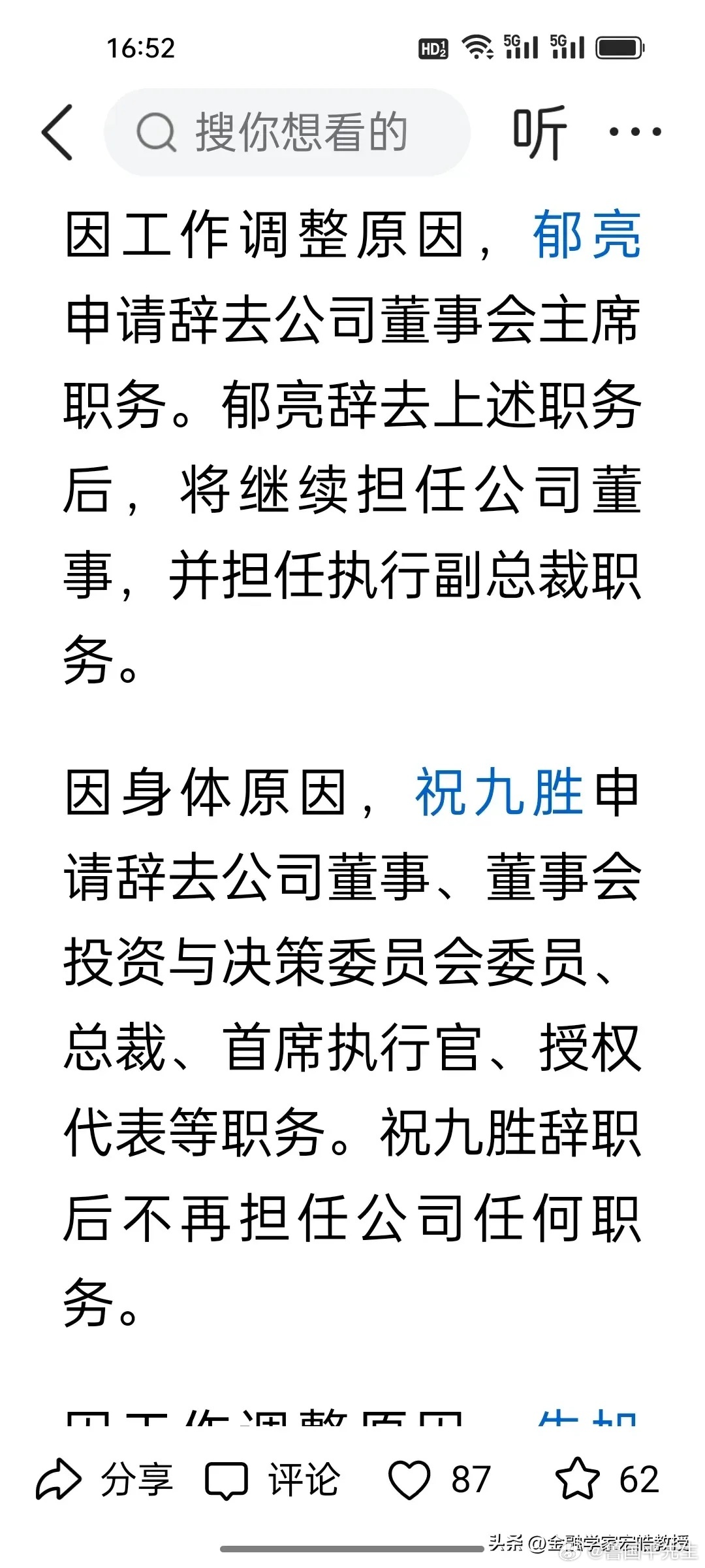 万科究竟发生了什么?刚刚,万科A公告,郁亮和祝九胜相继辞职,郁亮还担任公司董事,但是祝九胜什么职务都没有了。这离祝九胜被传出调查仅仅隔了一周。