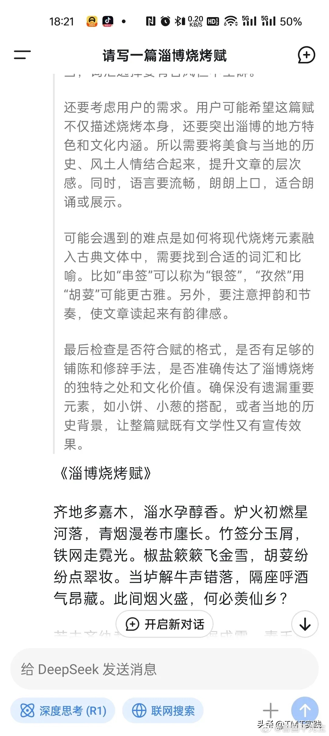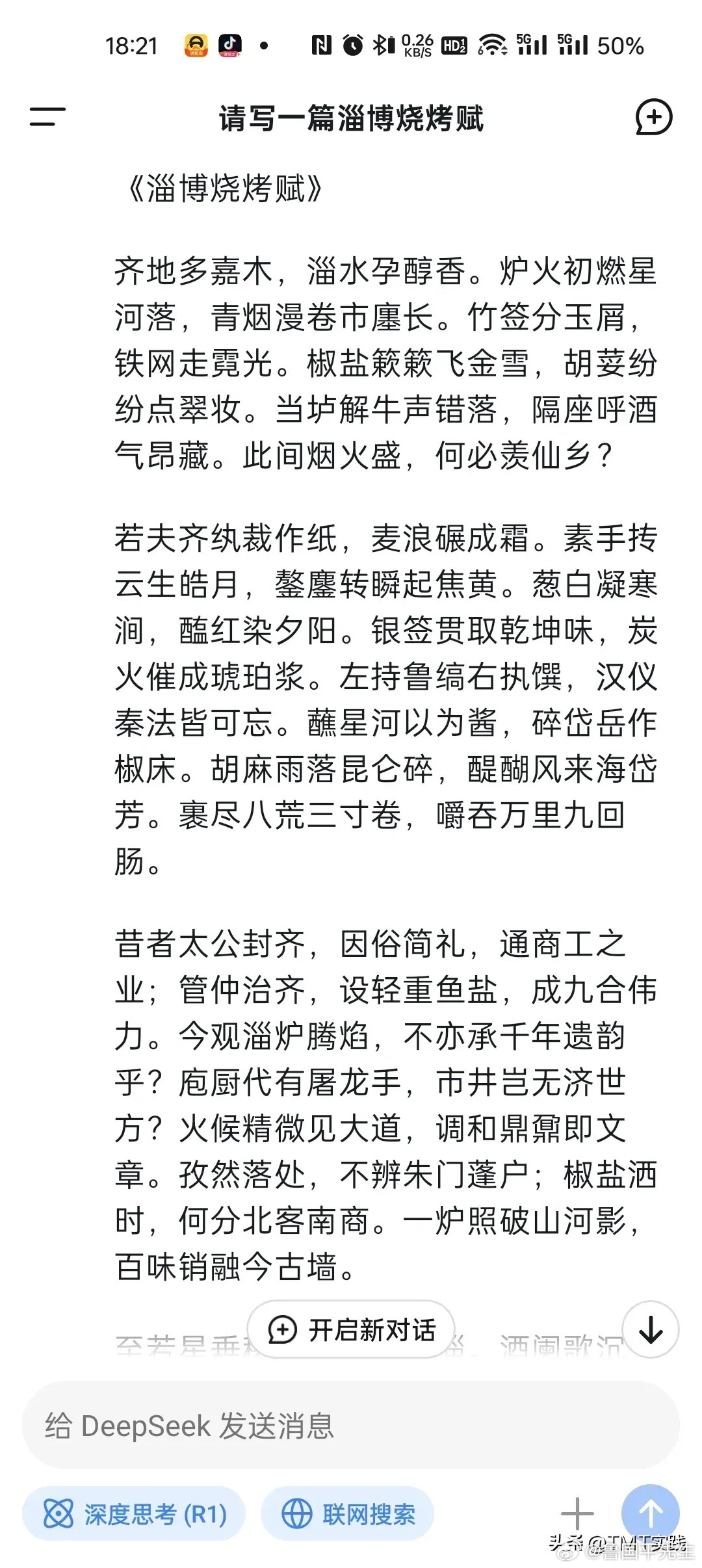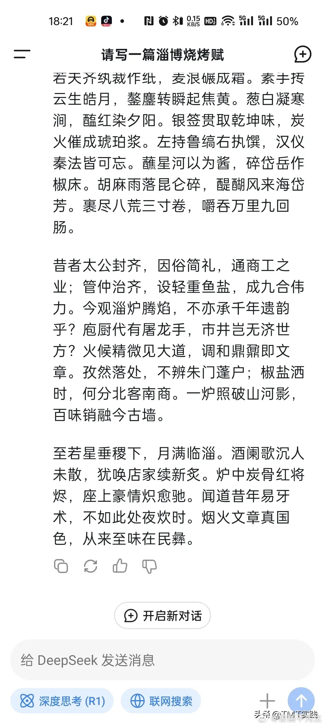 deepseek文学造诣已经让我震惊到无语了,让他写一篇 淄博烧烤赋,这文采,就算汉语言文学专业的教授恐怕也得汗颜。