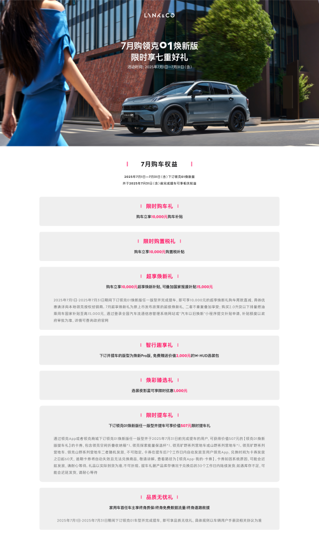 在产品力全面进阶的同时,领克01焕新版更以诚意满满的购车政策,让“全球品质”变得触手可及。针对7月购车用户,品牌推出限时优惠活动,叠加多项综合补贴后,全系专享价低至11.98万起,至高可享48507元综合权益,用实实在在的让利,降低年轻消费者的购车门槛。值得关注的是,这场优惠盛宴将于7月31日正式落幕,转瞬即逝的福利窗口对计划购车的朋友而言尤为珍贵。