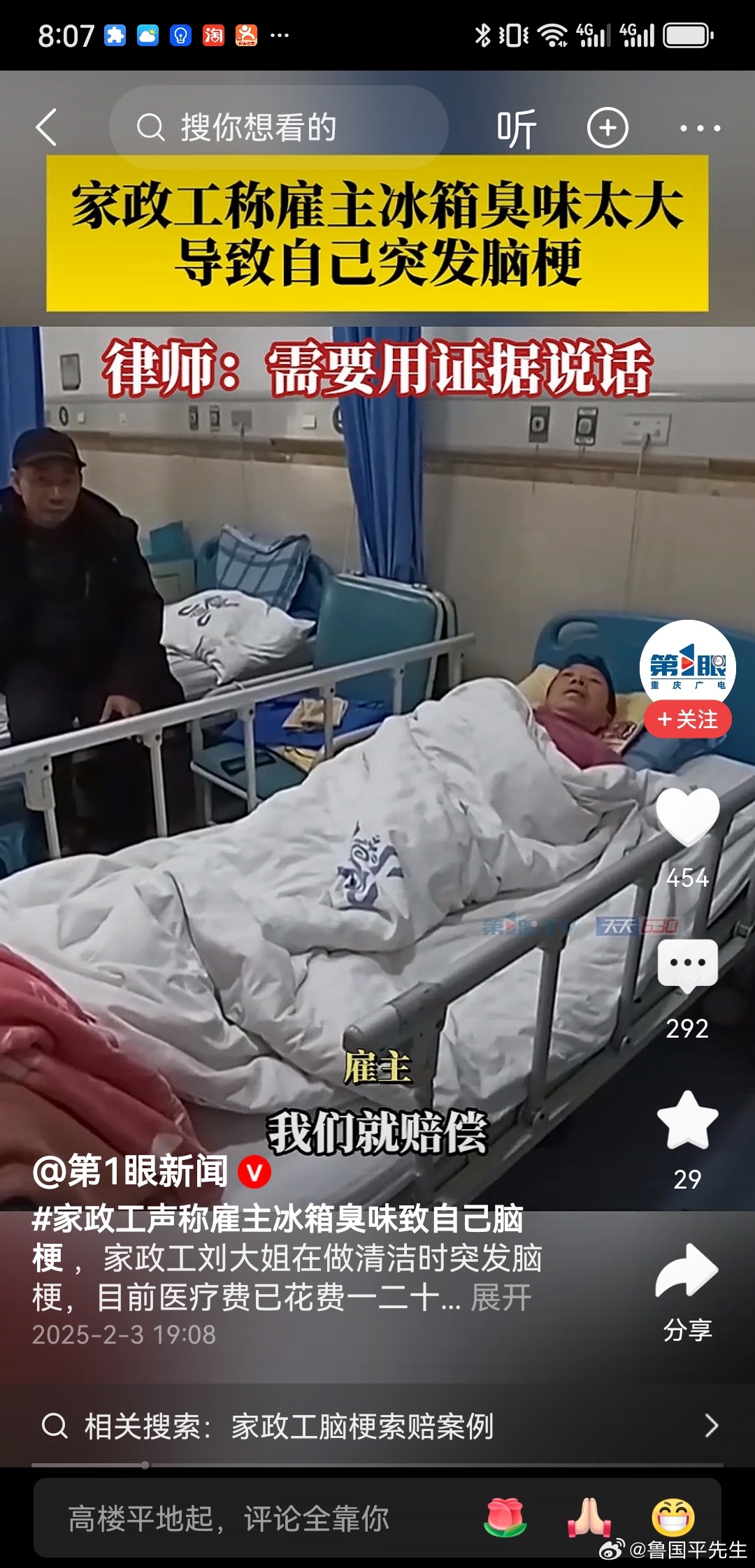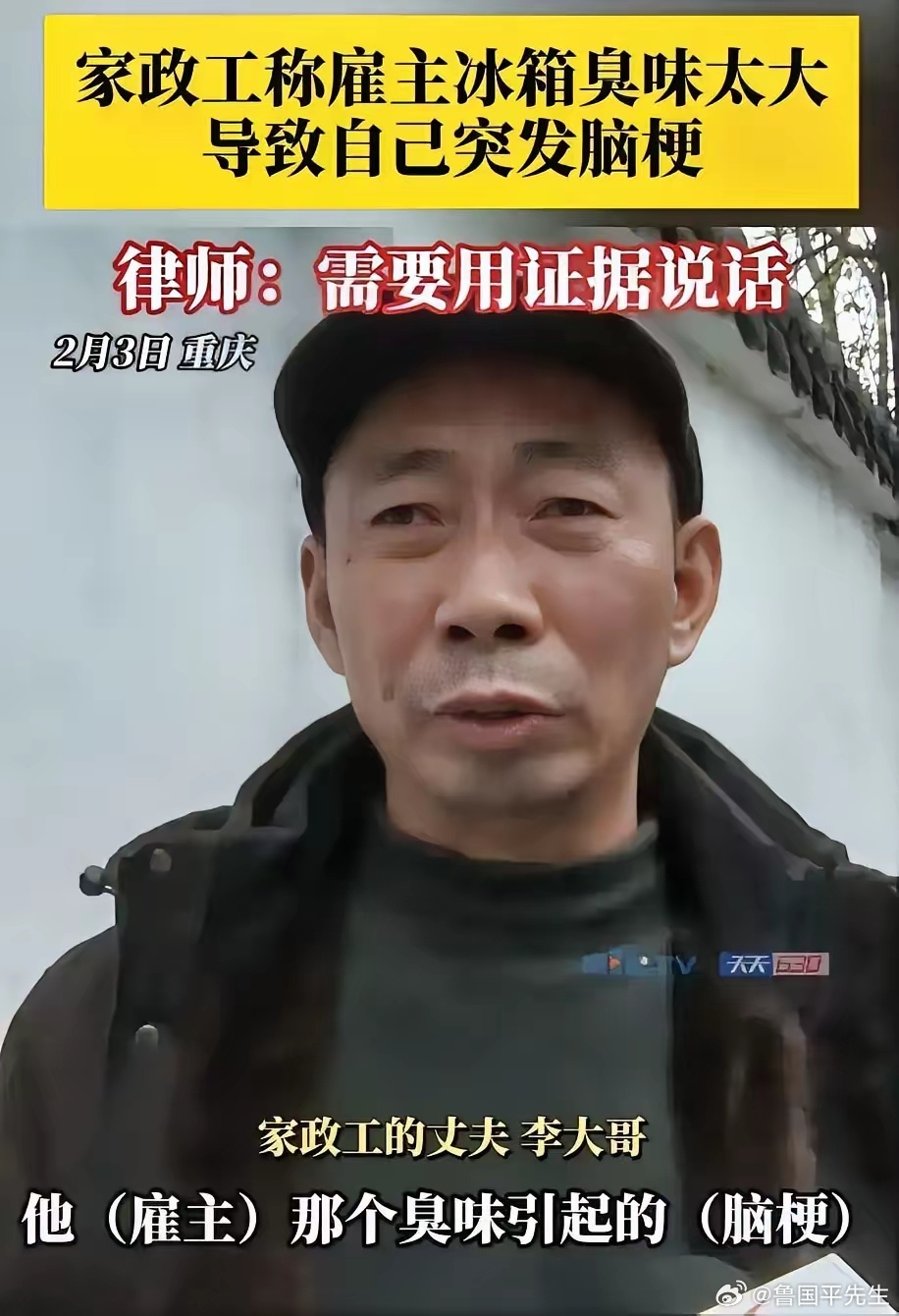 无语了!重庆一保洁阿姨在雇主家开冰箱时突然晕倒,一查是脑梗,花了近二十万。阿姨咬定是冰箱里腐肉味熏的,让雇主出八成医药费。可律师说要自证,医生也说脑梗不是一时半会得的。网友都在吐槽,做保洁咋不戴口罩?是不是想讹人?