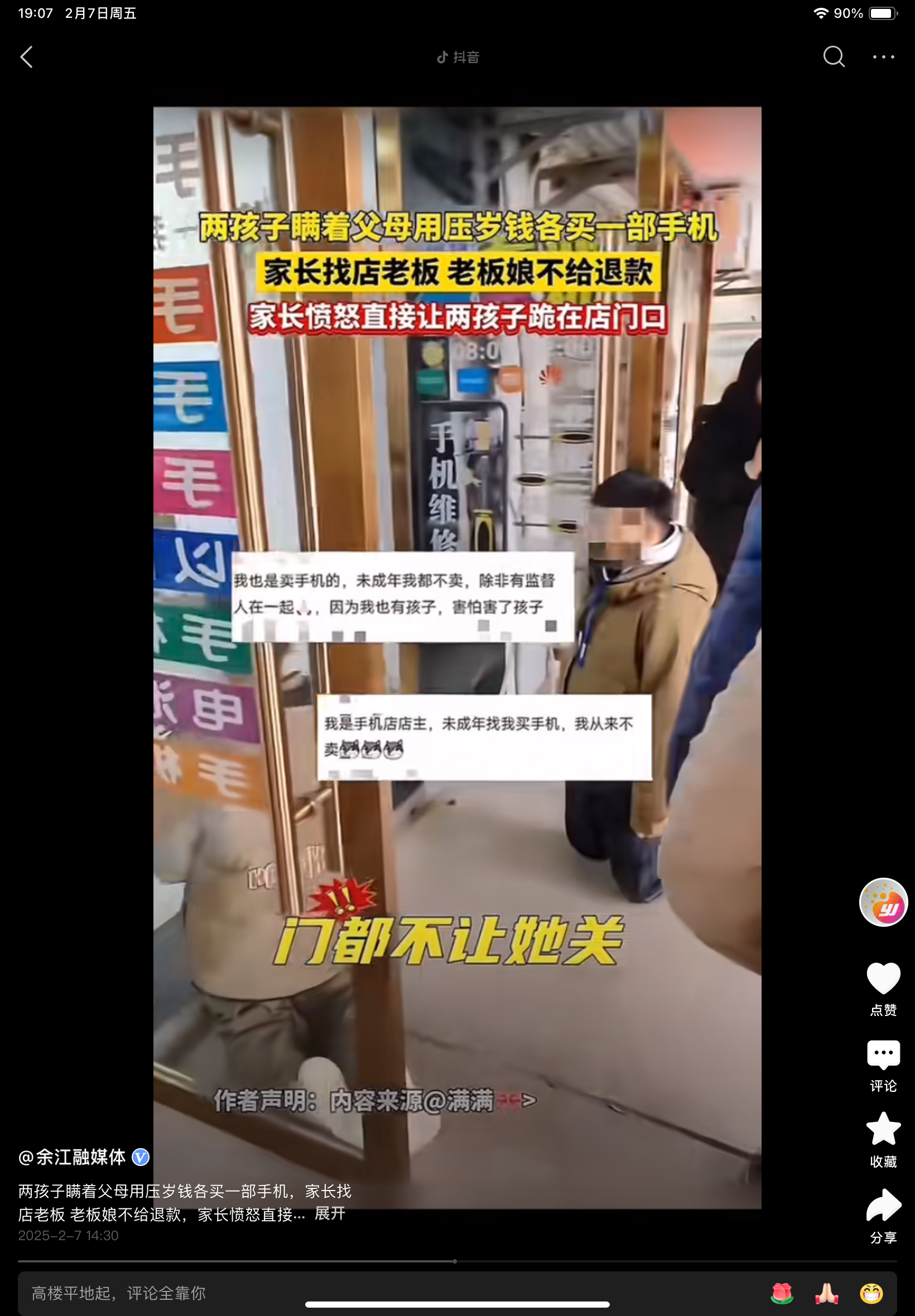 江西,两个小孩子拿着压岁钱去买了手机,父母找到老板退款无果后,就让两个孩子跪在店门口,不准他们动,也不准老板关门。此事引发网友热议,绝大多数网友都认为未成年人买手机应该得到父母同意才行。