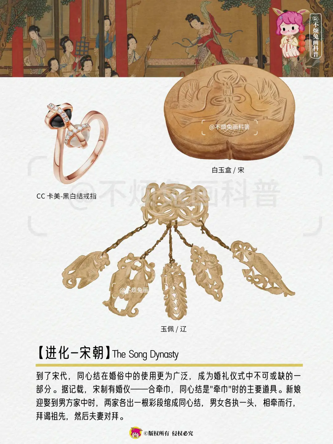 到了宋代,同心结在婚俗中的使用更为广泛,成为婚礼仪式中不可或缺的一部分。据记载,宋制有婚仪——合牵巾,同心结是"牵巾"时的主要道具。新娘迎娶到男方家中时,两家各出一根彩段绾成同心结,男女各执一头,相牵而行,拜谒祖先,然后夫妻对拜。