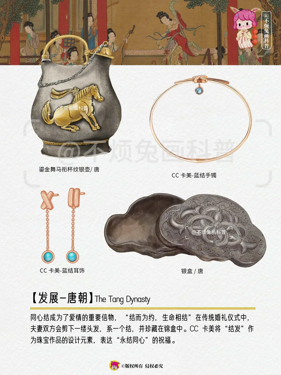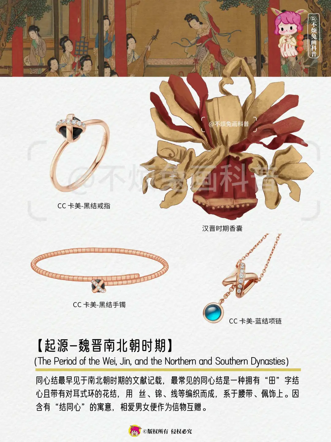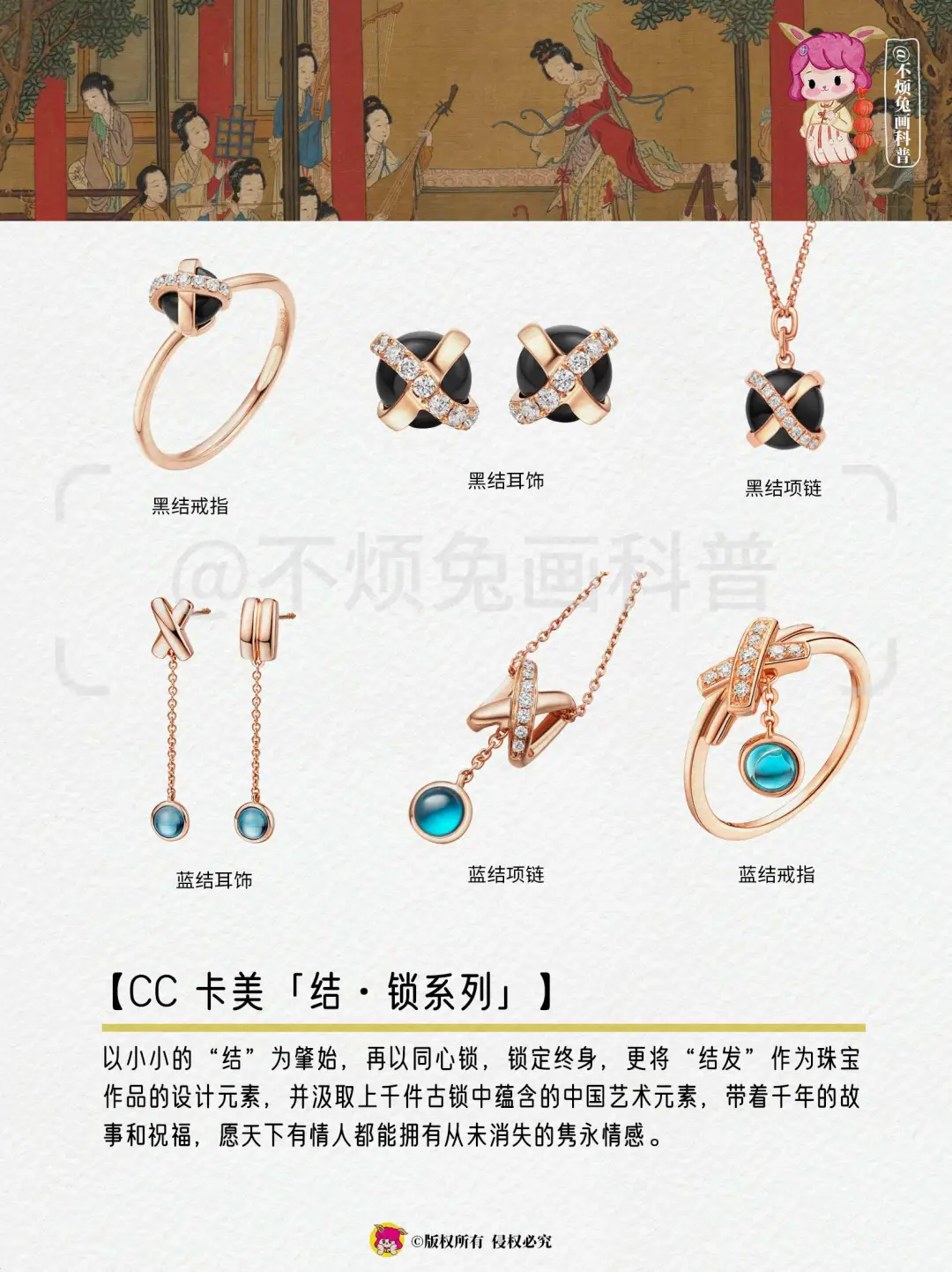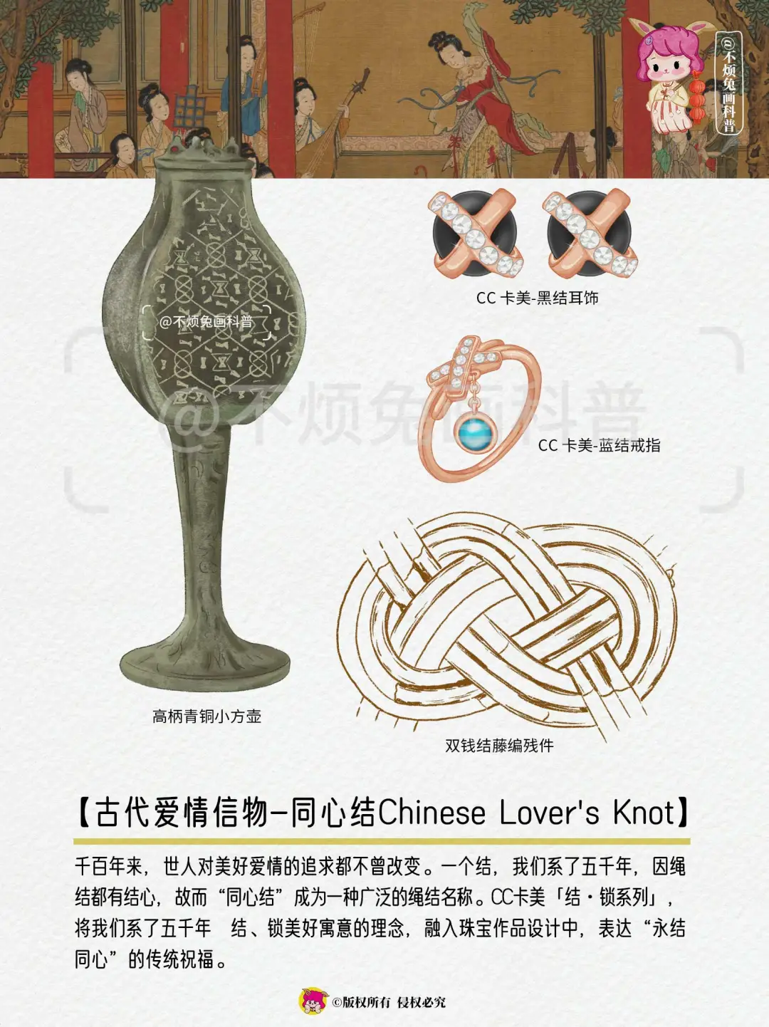 同心结成为了爱情的重要信物,“结而为约,生命相结”在传统婚礼仪式中,夫妻双方会剪下一缕头发,系一个结,并珍藏在锦盒中。CC 卡美将“结发”作为珠宝作品的设计元素,表达“永结同心”的祝福。