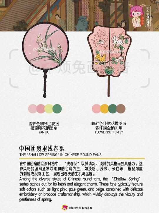 🪭在中国团扇的众多风格中,“浅春系”以其清新、淡雅的风格而独具魅力。这种风格的团扇通常以柔和的色调为主,如淡粉、浅绿、米白等,搭配细腻的刺绣或织锦工艺,展现出春天的生机与温婉。