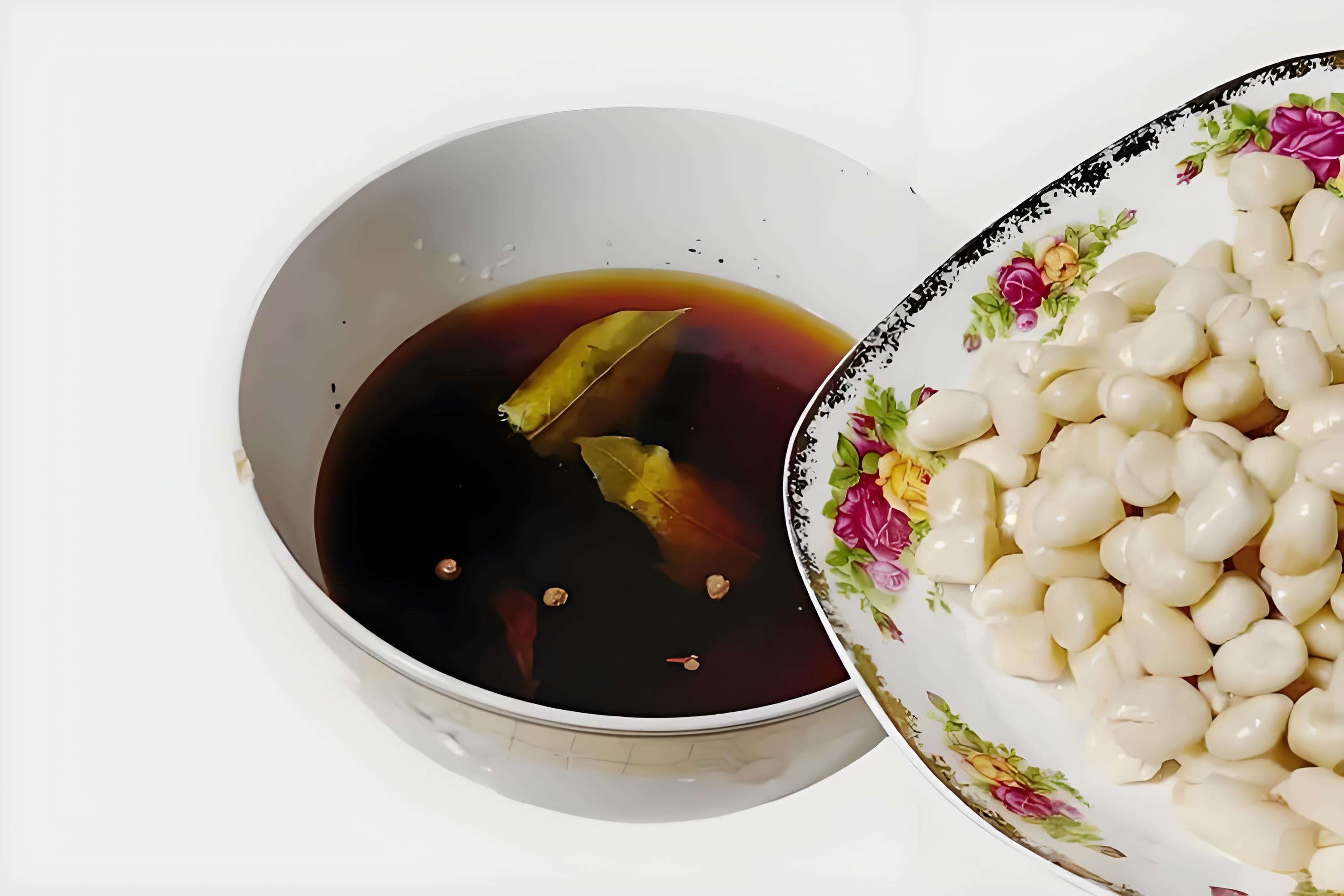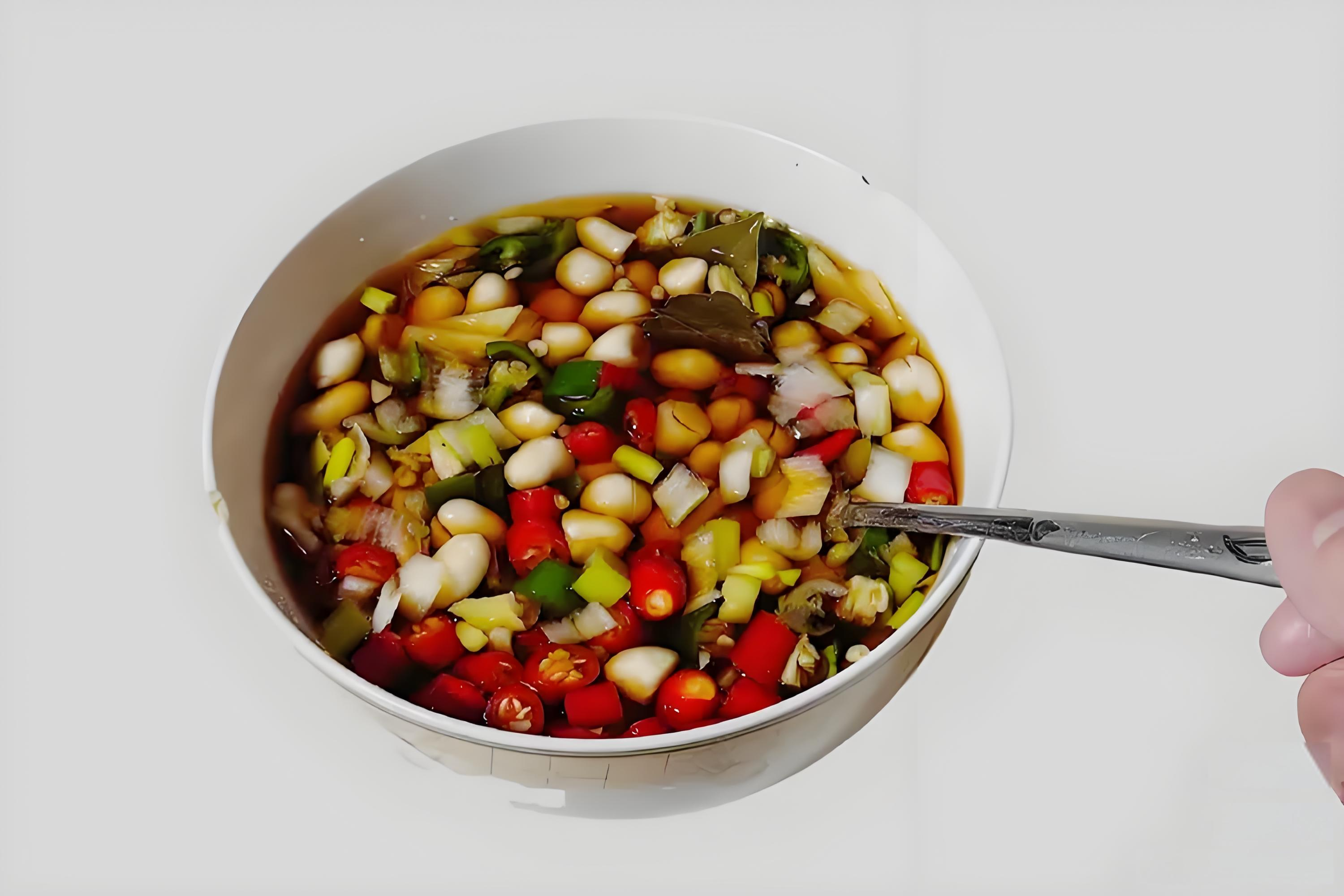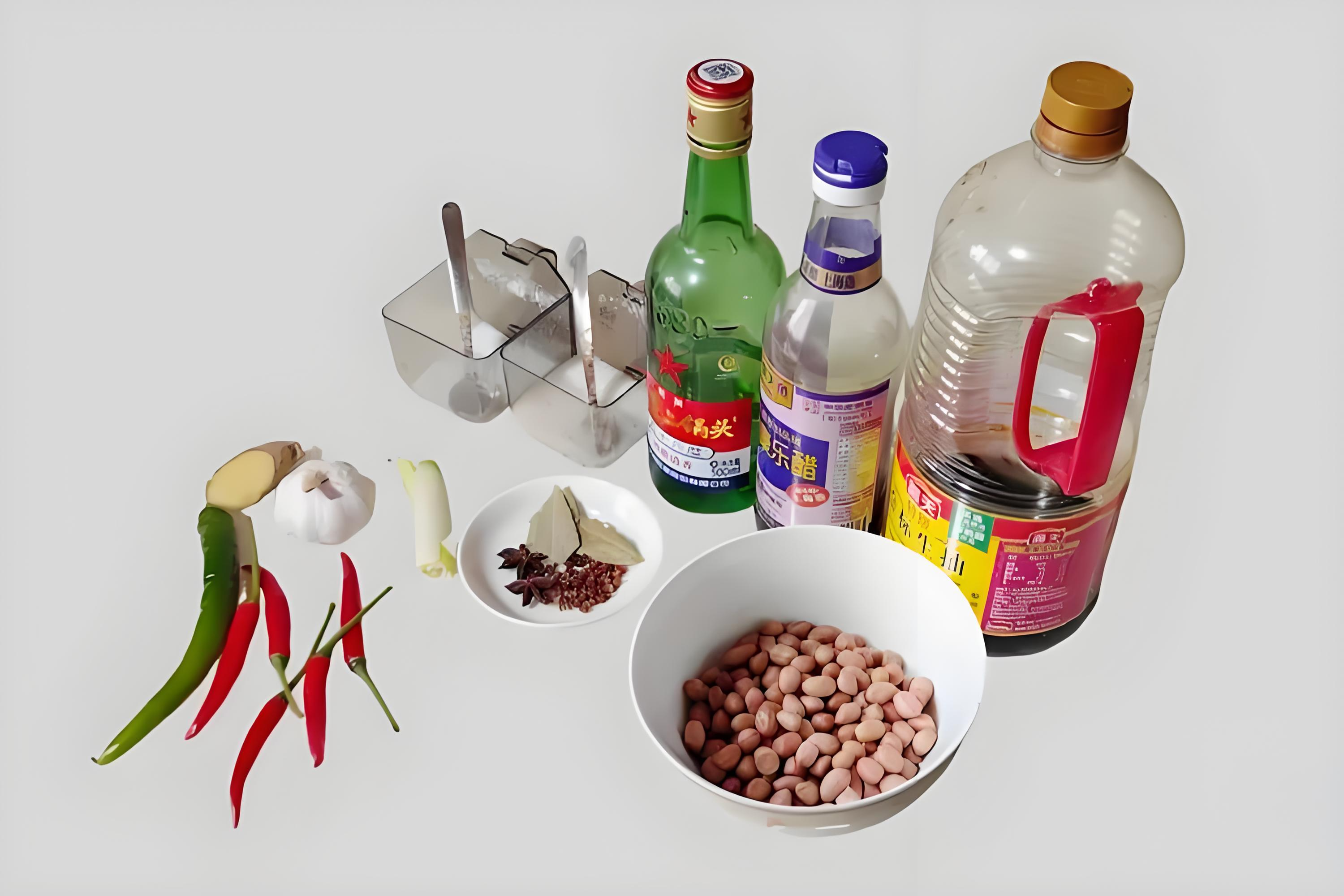 今天饭搭子说:咱油炸一盘花生米咋样?我说:太油腻了吧?生腌花生米我喜欢吃,但是自己还没有亲手做过,不如做一盘生腌花生米吧!好了,统一了思想,那就付之行动吧! 食材准备: 1、花生米。2、青红椒。3、大蒜头。4、生姜。5、大葱。6、生抽。7、白酒。8、盐和糖。9、八角。10、花椒。11、香叶。 制作过程: 1、花生米用开水浸泡两小时。2、青红椒切碎。3、大蒜头剁成蒜末。4、生姜切成片。5、盐+糖+生抽+白酒+醋调成料汁。6、八角+花椒+香叶放入锅中加水煮沸装碗备用。7、香叶水中加入料汁,再加入去皮花生米。8、加入青红椒碎、蒜末、生姜片。9、冰箱冷藏室冷藏两小时即可食用。