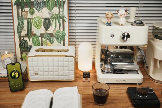 [哇R]这个小角落,核心就是一张120*60cm的老榆木书桌,简约又质朴。桌上摆着心爱的咖啡机,每天听着咖啡豆研磨的沙沙声,看着咖啡缓缓流入杯盏,香气瞬间弥漫。旁边那支摇曳的蜡烛,微光闪烁,给整个空间添了几分温馨与惬意。而最亮眼的,当属JBL音乐世家A200音箱。