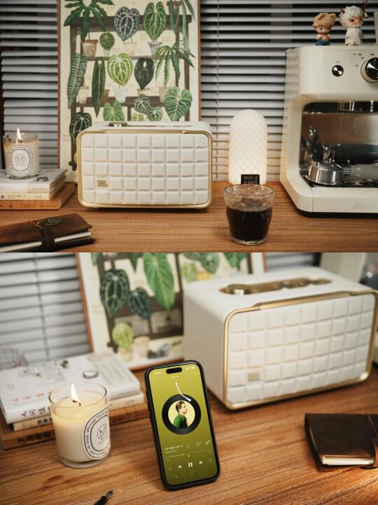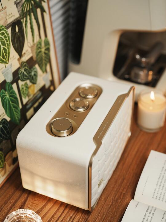 🎶它的外观设计简直绝了,白金配色时尚又有质感,艺术韵味满满。经典的方格装饰不经让我想到白色巧克力。搭配上方简洁的月光星韵操控面板,还有磨砂质感的金色旋钮与星韵灯带相互呼应,放在桌上,瞬间提升格调,完美融入这个温馨小角落,为家居美学加分不少。而且它玲珑小巧,一点也不占空间。