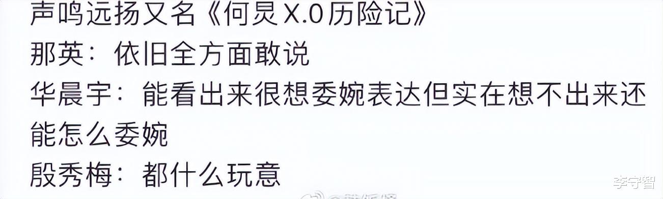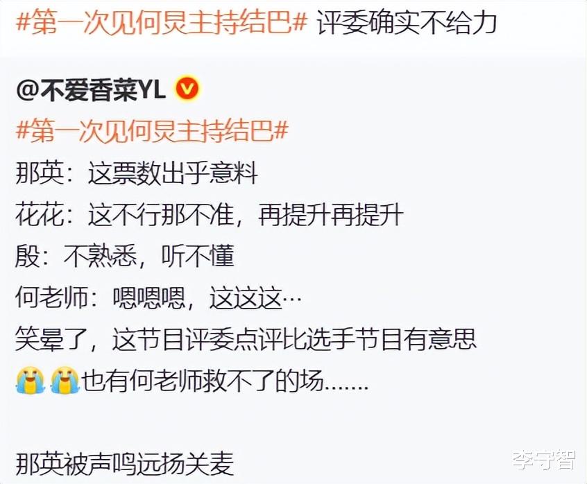 所谓天后那英有口才有唱功但专业功力太差,翻来覆去在综艺节目活跃,从导师到选手再到评委,点评依然毫无长进,连蔡国庆都不如。还好那英和观众一样能分高低,而且胆子大,敢于质疑节目效果,为选手成绩鸣不平,结结巴巴词不达意,综艺感拉满。