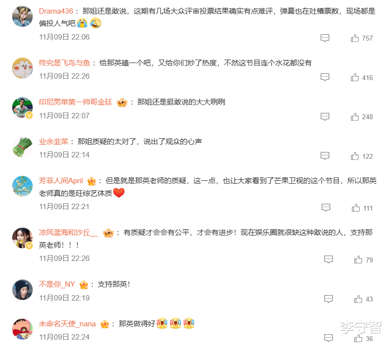 所以,虽然那英点评也不专业深刻,但好在胆子大,喜欢说话,于是每对比赛点评几乎都是她在那咋咋呼呼自我表演。唯独做对了一件事,就是质疑现场观众打分公平性,这是很多年观众都吐槽湖南卫视选秀的槽点和一点。
