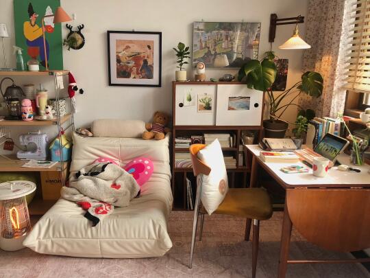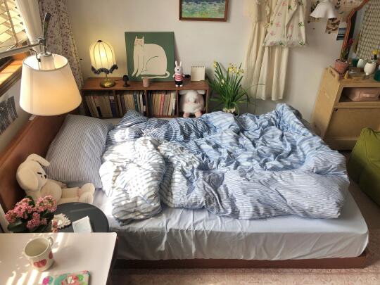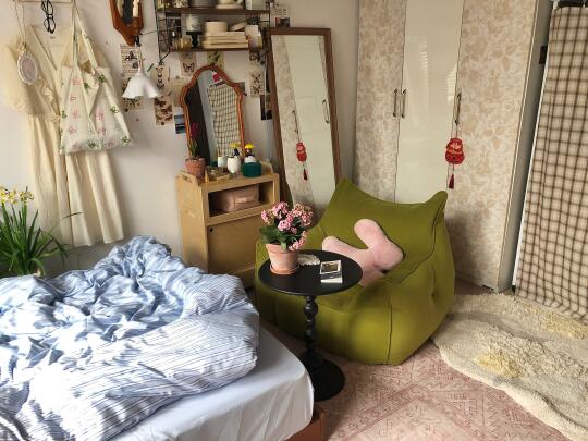 我的卧室只有12平 摆脱了传统卧室只有床和衣柜的限制 书桌 书柜 置物架 甚至懒人沙发都放了两个 分享一下我的改造思路: 🛏️选择1.2的小床能节省不少空间 一个人也够睡~床尾依次是梳妆台,全身镜,衣柜 一点空间都不浪费 📚东西比较多就选择书柜置物架 能装也不会显得很乱 我的书桌经常换位置但是不论怎么变 空间也是足够的 👗我的衣柜只有1.2不够放 就加了一个衣架也是1.2 💙整体布置下来虽然满满当当但对我来说并没有很拥挤的感觉 仅供参考啦