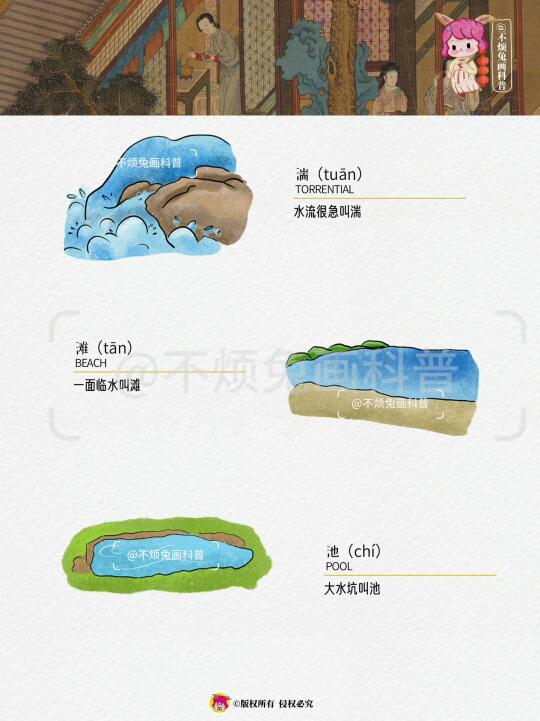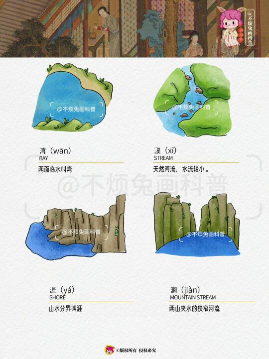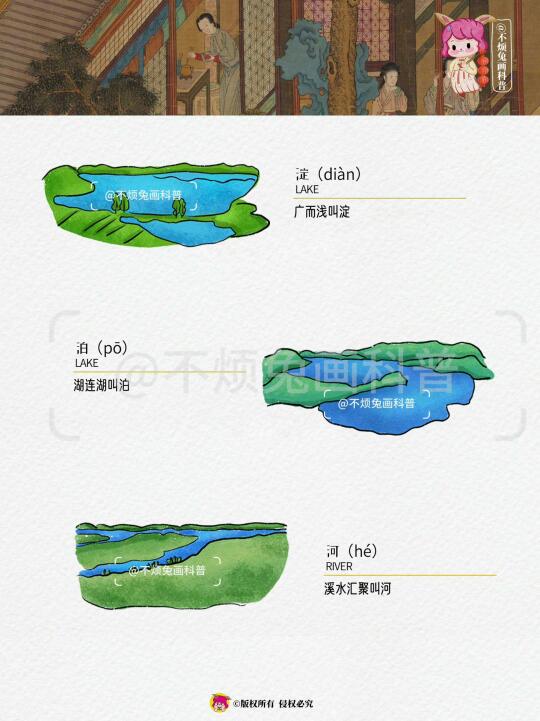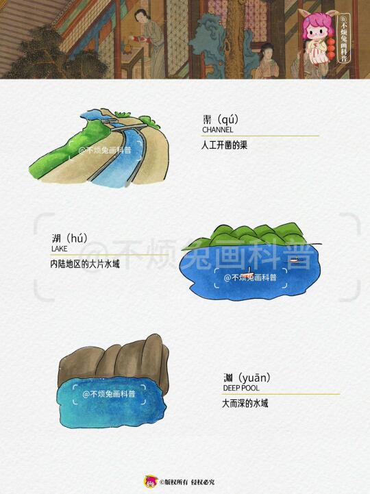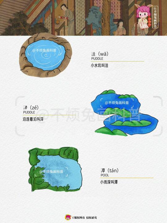 💦在中国,水体的不同形态和特征有着丰富多样的称呼,这些名称不仅反映了水体的自然属性,还体现了地域文化和民族语言的特色。 - 🔹洼Puddle 🔹泽Marsh 🔹潭Pool 🔹湍Torrential 🔹滩Beach 🔹池Pool 🔹淀Lake 🔹泊Lake 🔹河River 🔹渠Channel 🔹湖Lake 🔹渊Deep Pool 🔹湾Bay 🔹溪Stream 🔹涯Shore 🔹涧Mountain Stream -