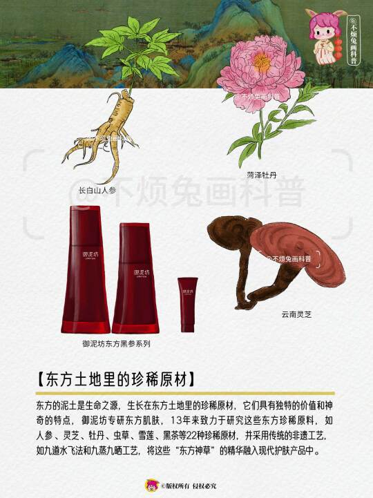 🍃东方的泥土是生命之源,生长在东方土地里的珍稀原材,它们具有独特的价值和神奇的特点,御泥坊专研东方肌肤,13年来致力于研究这些东方珍稀原料,如人参、灵芝、牡丹、虫草、雪莲、黑茶等22种珍稀原材,并采用传统的非遗工艺,如九道水飞法和九蒸九晒工艺,将这些“东方神草”的精华融入现代护肤产品中。