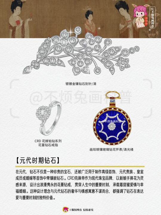 在元代,钻石不仅是一种珍贵的宝石,还被广泛用于制作高级首饰,元代贵族、皇室成员或婚嫁等首饰中常镶嵌钻石,强调了钻石在表达爱与重要时刻的独特价值。