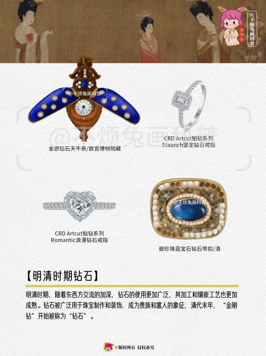 明清时期,随着东西方交流的加深,钻石的使用更加广泛,其加工和镶嵌工艺也更加成熟。钻石被广泛用于珠宝制作和装饰,成为贵族和富人的象征,清代末年,“金刚钻”开始被称为“钻石”。