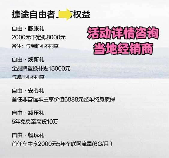 想要在当下的汽车市场拿下更多的销量和关注度,那么实惠的车型价格则是一张有诚意的入场券,捷途自由者该车的官方指导价为12.49万至15.49万元,同时该车还可享受限时权益价10.79万元起的购车权益,可以说就该车价格对于一台具备越野能力的方盒子SUV而言还是有着不错的吸引力。更值得一提的是,目前购车还能享受2000元抵8000元、15000元置换补贴等优惠政策(活动详情请咨询当地经销商),进而更加适合不少预算有限的年轻消费者。