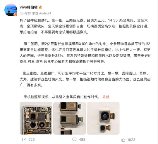 宝子们,vivo 产品经理韩伯啸今天爆料了 X200 Ultra 镜头模组! [得意R]我快速给大家盘一盘。 经典大三元的组合:14mm+35mm+85mm 三个角度都是超大底,随心切换,画质都很顶。 14mm广角强的可怕,风光、建筑、广角人像, 轻松拿捏。 新款2亿巨型长焦带模组,比上一代的还要大一些。 更大的光圈,进光量提升38%,还有特殊透镜、棱镜技术和新镀膜的加持,性能提升明显。 实用大三元组合式你的菜吗?普通人还有必要上微单吗?直接上V单就行了吧!