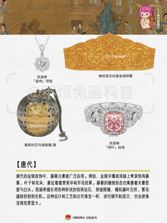 唐代的金银首饰中,藤蔓元素被广泛应用。例如,金银手镯或项链上常装饰有藤蔓、叶子和花朵,象征着富贵荣华和开花结果。藤蔓的缠绕形态也寓意着夫妻恩爱与白头。凯丽希擅长用各种形状的培育钻石,拼接围镶,模拟藤叶交织、繁花盛放的勃勃生机。这种设计和工艺和古代珠宝一样,讲究细节和层次,也会使珠宝视觉更显大。