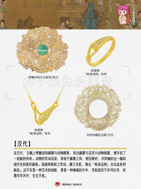在汉代,玉佩上常雕刻有藤蔓与动物图案,而当藤蔓与花灵小动物相遇,便开启了一段新的传奇。动物的灵动活泼,穿梭于藤蔓之间,相互映衬,共同编织出一幅和谐共生的美好画卷。凯丽希取蛇之灵动、藤之生机,推出「蛇来运转」古法金系列新品。这不仅是一种艺术的创新,更是一种情感的升华,灵蛇游历于岁月长河,祈愿年年岁岁,生生不息。
