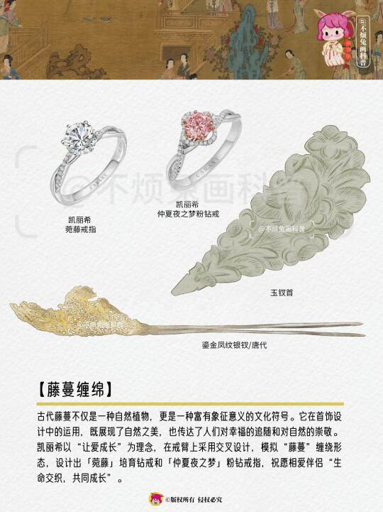 古代藤蔓不仅是一种自然植物,更是一种富有象征意义的文化符号。它在首饰设计中的运用,既展现了自然之美,也传达了人们对幸福的追随和对自然的崇敬。凯丽希以“让爱成长”为理念,在戒臂上采用交叉设计,模拟“藤蔓”缠绕形态,设计出「菀藤」培育钻戒和「仲夏夜之梦」粉钻戒指,祝愿相爱伴侣“生命交织,共同成长”。