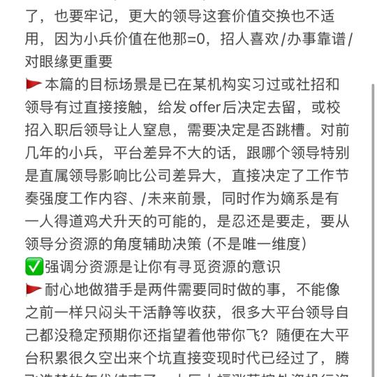 🚩本篇的目标场景是已在某机构实习过或社招和领导有过直接接触,给发offer后决定去留,或校招入职后领导让人窒息,需要决定是否跳槽。对前几年的小兵,平台差异不大的话,跟哪个领导特别是直属领导影响比公司差异大,直接决定了工作节奏强度工作内容、/未来前景,同时作为嫡系是有一人得道鸡犬升天的可能的,是忍还是要走,要从领导分资源的角度辅助决策(不是唯一维度)