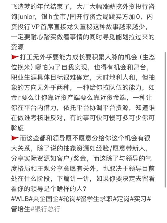 🚩打工无外乎要能力成长要积累人脉的机会(生态位换米)哪怕为了自我实现,也得有机会和舞台,职业生涯具体目标很难确定,天时地利人和,但抽象的方向无外乎两种,一种给你拉队伍的能力,如金r要么让你靠近资产端要么靠近资金端,一种让你在平台内借力,依托平台协调平台资源,知道谁在做谁考核谁反对,有的事可快可慢可多可少你可斡旋
