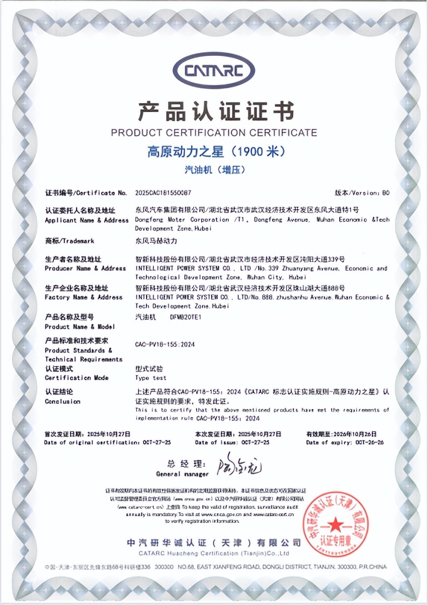 东风马赫B20TDE纵置混动专用发动机获“高原动力之星”认证