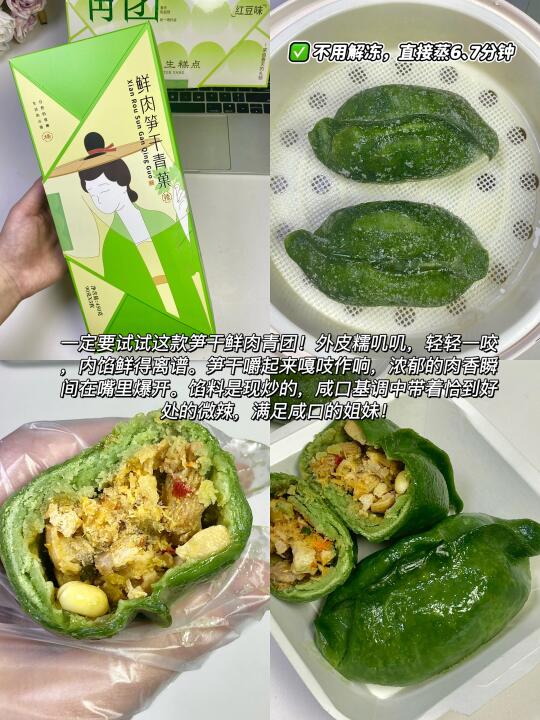 最近疯狂痴迷青团,尝了好多牌子,直到遇见这两个青团,直接原地封神!必须安利给你们! ✅红豆艾草青团 一口下去,细腻绵密的红豆沙在舌尖散开,甜度拿捏得恰到好处,一点都不腻,口感就像在吃红豆冰淇淋,外皮冰冰凉凉,软嫩Q弹 ,艾草独特的清香超浓郁。 ✅鲜肉笋干馅的青团 外皮糯叽叽,轻轻一咬,内馅鲜得离谱。笋干嚼起来嘎吱作响,浓郁的肉香瞬间在嘴里爆开。馅料是现炒的,咸口基调中带着恰到好处的微辣,不仅吃多了不会腻,低卡属性还能毫无负担地解馋 ,吃上一口就直接被俘获!