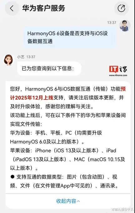 根据IT之家报道,华为客户服务随后表示,HarmonyOS 6 与 iOS 数据互通(传输)功能预计2025年12月上线,支持传输图片、视频、文件等。