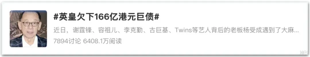 事实上,此次陷入债务风波的主体是杨受成旗下主营房地产的“英皇国际”,而非大众熟知的、拥有众多艺人的“英皇娱乐”。