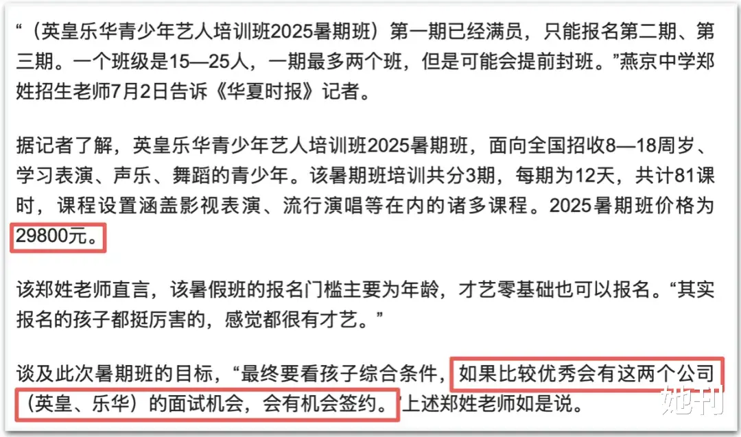 最近,她盯上了偶像培训业务,与内娱另一家头部经纪公司乐华娱乐,共同开办了“英皇乐华青少年艺人培训班”,12天的课程收费29800元。