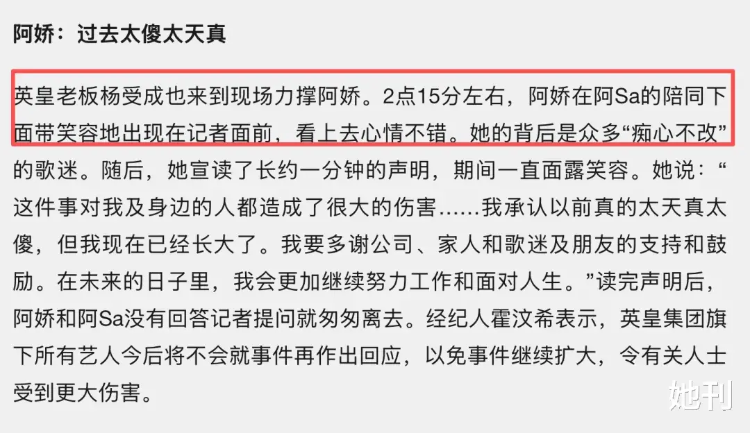 在阿娇率先站出来直面公众时,经纪人与老板全程护航;