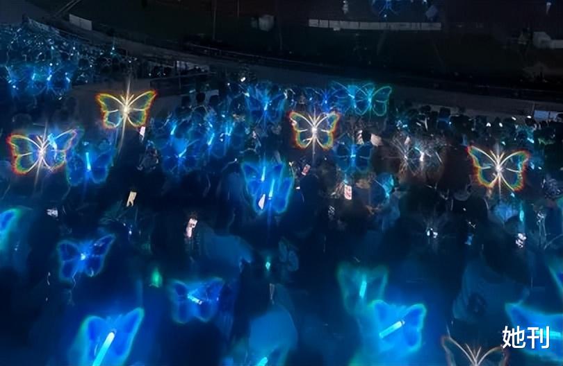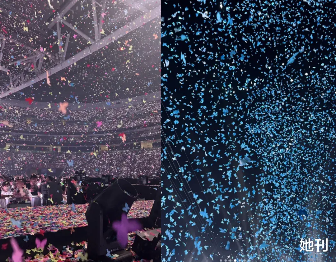 在唱到经典歌曲《玉蝴蝶》时,伴随着音乐,内场会洒下彩色纸蝶或Tiffany蓝色香水蝶,而在露天场馆,则以绚丽的VR蝴蝶点亮夜空,科技感十足。