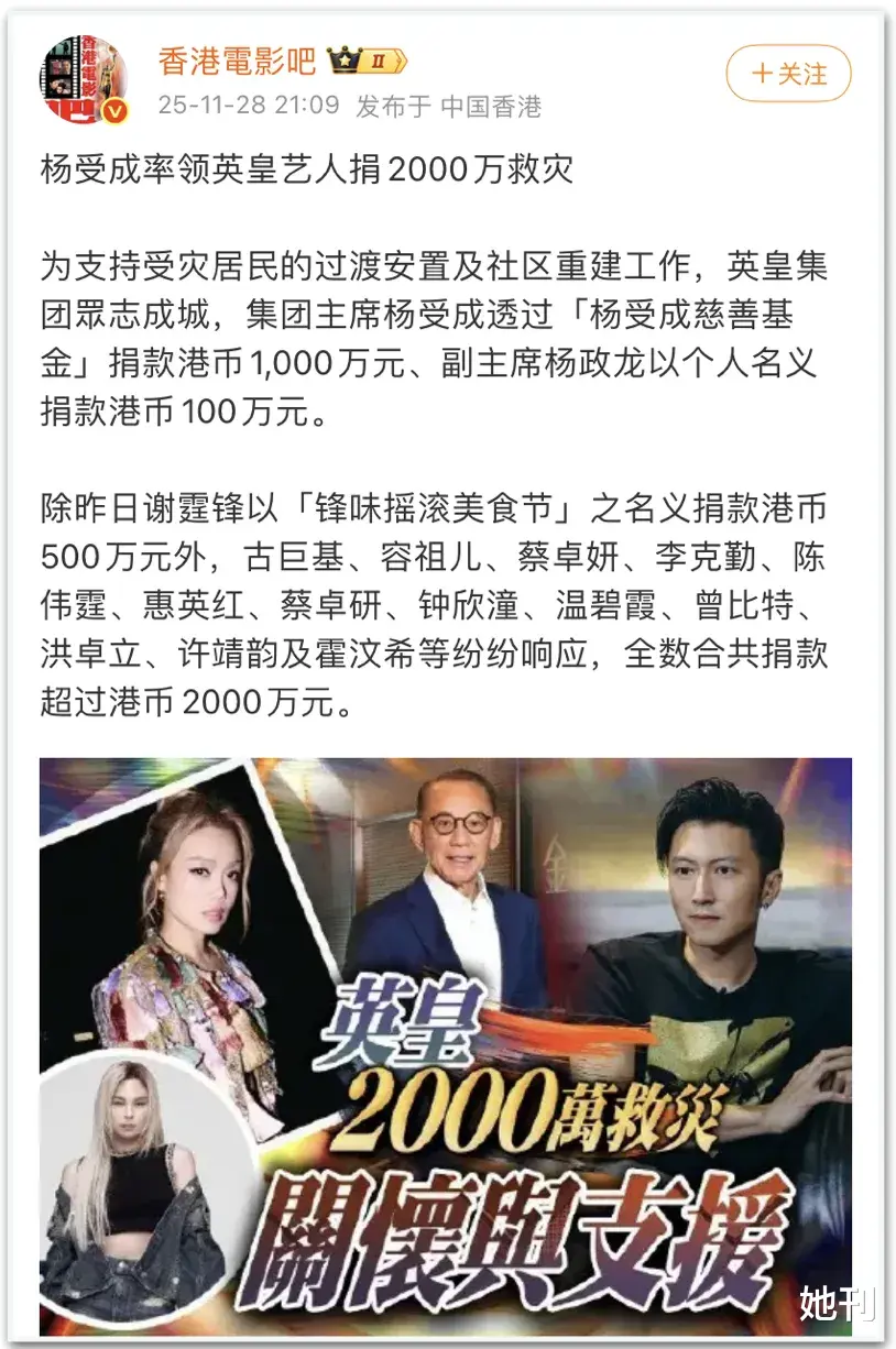 就在此刻,当全社会都在为香港火灾揪心之时,英皇老板杨受成率领旗下艺人累计捐款2000万港币。
