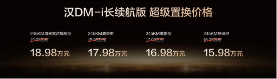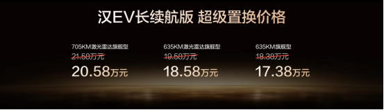 此次,汉DM-i长续航版共推出4款车型,补贴后售价15.98万~18.98万元;汉EV长续航版共推出3款车型,补贴后售价17.38万~20.58万元(10月31日前完成购车可享1万元超级置换补贴)。同时,比亚迪还为用户准备了包含置换补贴在内的至高价值3.8万元七大礼遇