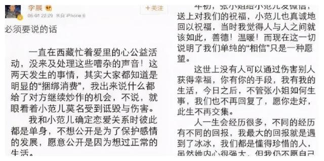 他们公布恋情的那一天,张馨予发了一篇“告别”李晨的微博。对于这段恋情的结束,张馨予的态度是这样的: “我感谢你在我被质疑被诽谤的时候挺身而出,陪伴与信任,你是好男人,我是坏女人,应该庆幸我不再耽误你了。”可见,她是放不下李晨的。然而,面对这段逝去的感情,她有多眷念,就注定了有多狼狈。