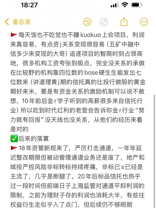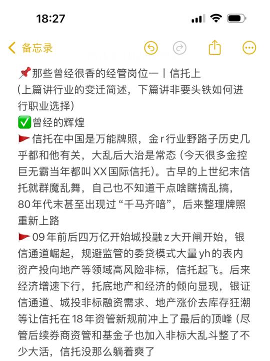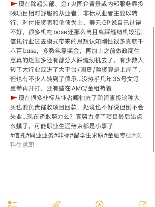 🚩现在除超头部、金r等央国企背景等内部服务靠投喂项目相对舒服的从业者,主要以转行、对付投资者和催债为主,美元GP说自己过得不好,很多机构base还那么高且离踩缝纫机较远,信托行业过去模式带来的思想认知刚性很多真就千八百base,多数纯靠奖金,再加上之前做政商生意真的烂账多还有部分人踩缝纫机去了。有少数人转了大行业或进了大平台/国资/险资算是上岸了,但也有不少人转到了债承…没热乎几年35号文等重拳再开打,还有些在AMC/金租苟着
