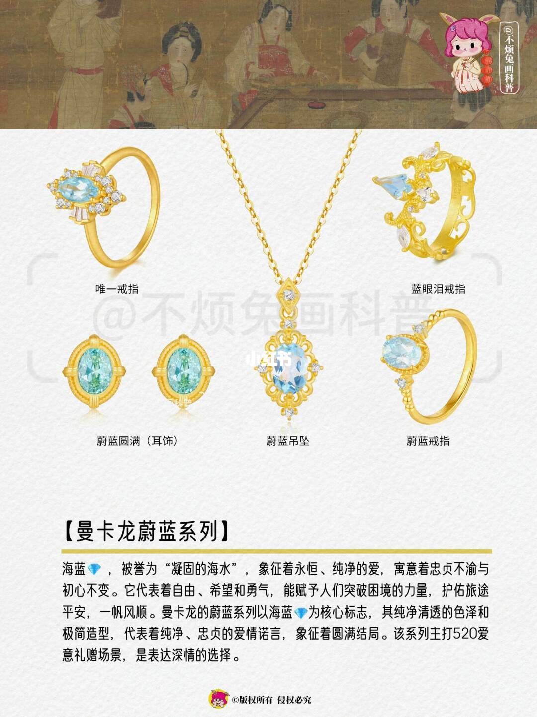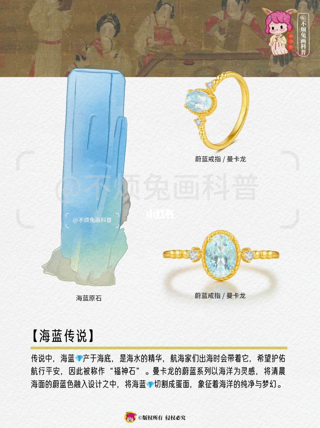 明代时期,海蓝💎的加工和镶嵌工艺达到了精湛的水平,工匠们将海蓝💎切割成多种形状,然后巧妙地将其镶嵌在金银饰品之中,使其与红宝石、珍珠等石相互映衬,共同营造出一种色彩斑斓、绚丽夺目的装饰效果。曼卡龙蓝眼泪戒指,将海蓝💎切割成马眼形状,镂空戒托如旋转的皇冠与裙摆,佩戴时仿佛置身童话舞会。
