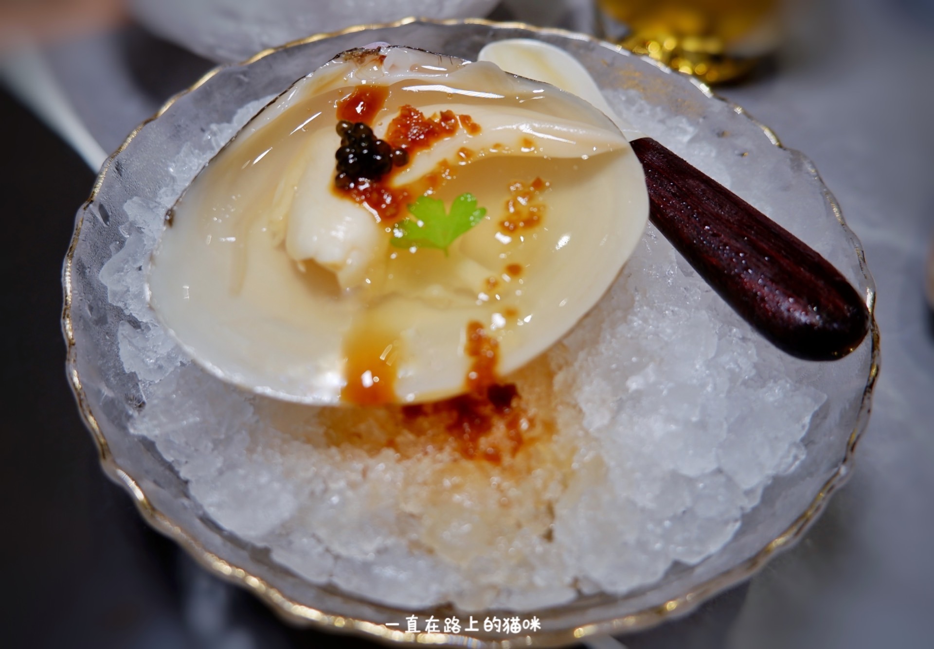 一人一份,蚌仔做成冻又放入蚌壳中,现浇上特制酱汁,入口有果冻一样的口感,蚌仔的鲜甜Q弹,回味又有鸡汤的鲜美,搭配的贝壳勺,视觉味觉上的双重享受。
