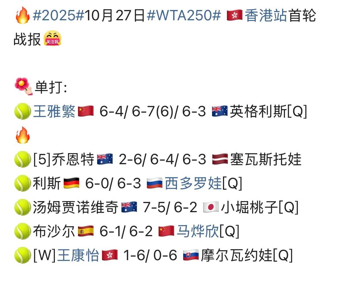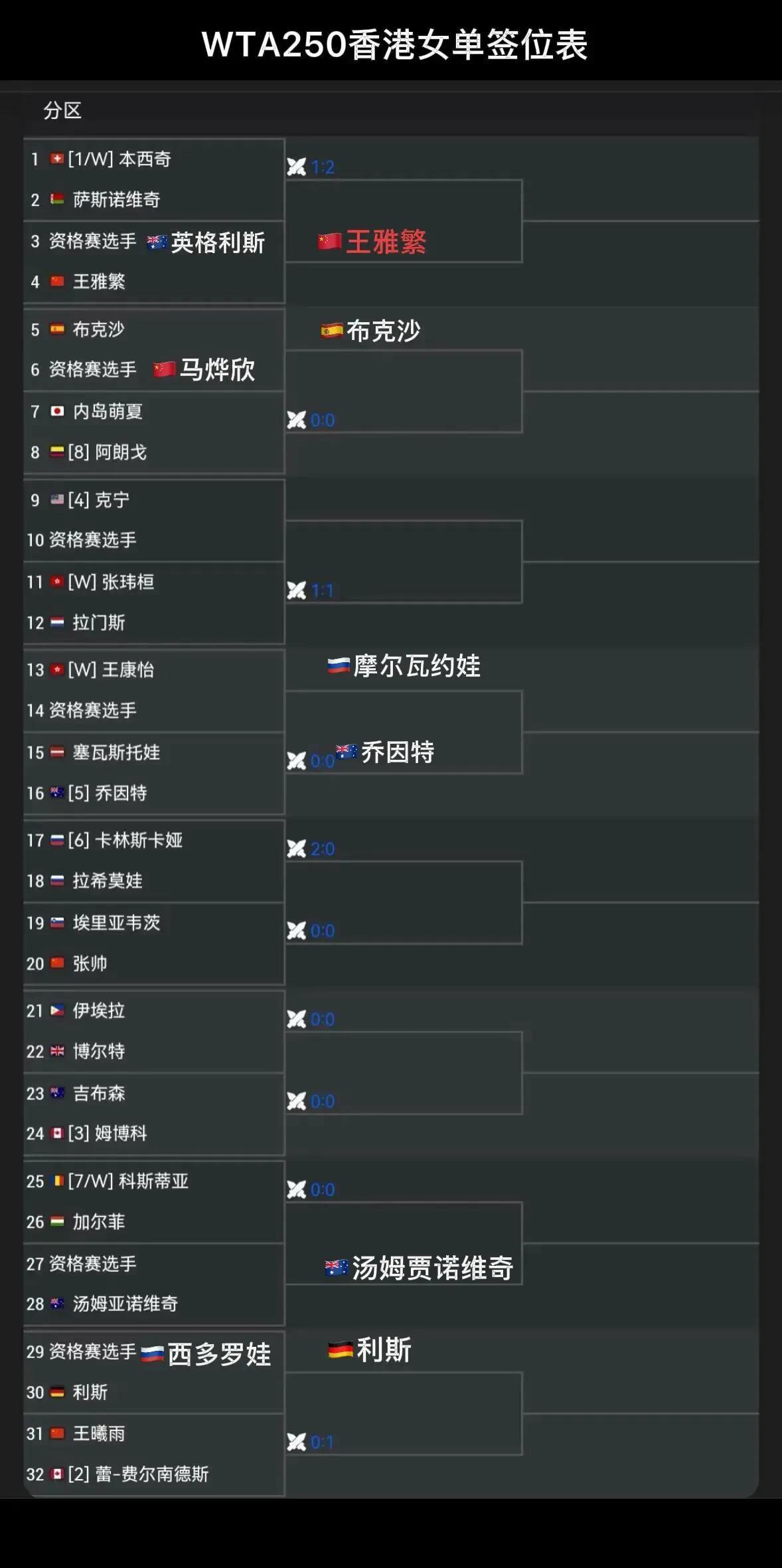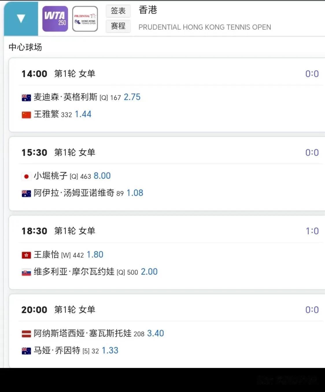 WTA250香港女单32签位,本西奇、费尔南德斯、姆博科、肯宁、乔因特、卡琳斯卡娅、科斯蒂亚、阿朗戈位列前八种子!外卡选手2人、资格赛选手6人、依排名入围16人!女单首轮焦点赛程战报⬇️⬇️1、✅中国王雅繁6-4、6(6)-7、6-3险胜资格赛选手澳大利亚英格利斯;