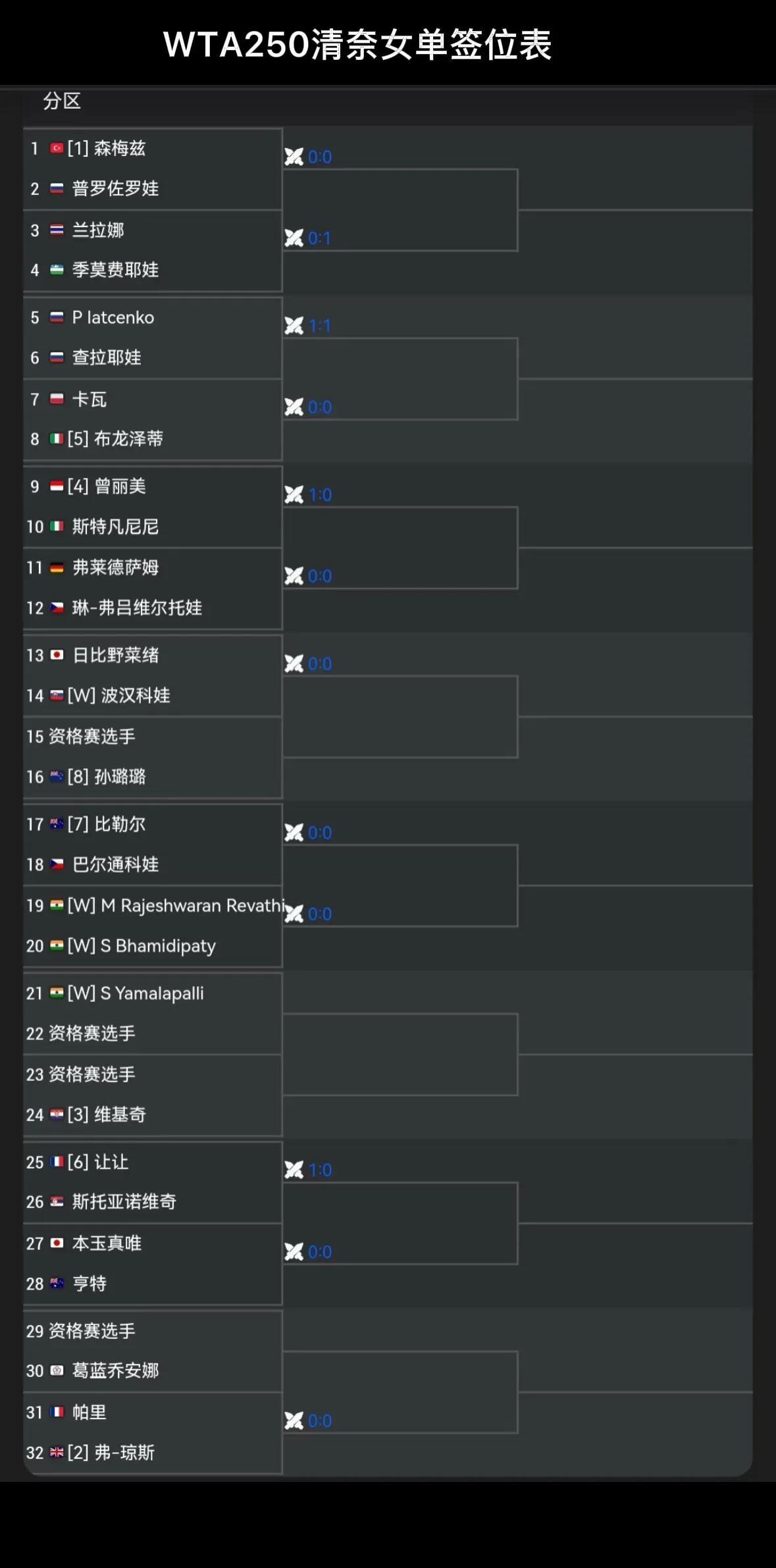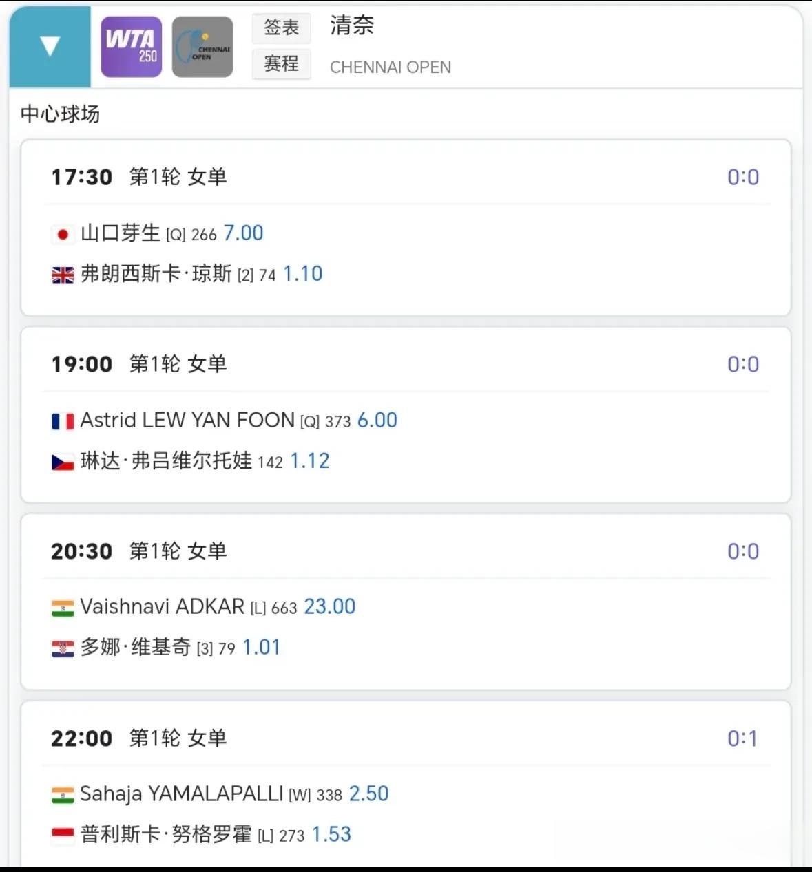 WTA250印度清奈站女单32签位,森梅兹、琼斯、维基奇、曾丽美、布隆泽蒂、让让、比勒尔、孙璐璐位列前八种子,外卡选手4人、资格赛选手4人、依靠排名入围16人!女单首轮焦点赛程战报⬇️⬇️1、2号种子英国琼斯vs资格赛选手日本山口牙生;