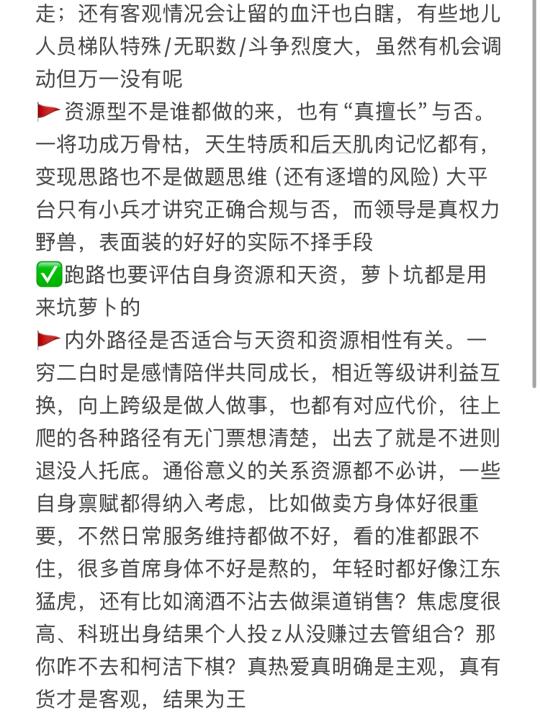 🚩资源型要用时间豪d,十年饮冰的中途血汗能否承受?虽然想进步一定要脱皮,但也有能否承受之分,领导窒息/强度过大,比如一些行普惠业务每年都有人身体崩塌,度日如年熬不过去的,血肉苦短机械飞升不成?还有些人即便已高度社会化也不擅长/不喜欢体系内的做派、对氛围排斥,也只能走;还有客观情况会让留的血汗也白瞎,有些地儿人员梯队特殊/无职数/斗争烈度大,虽然有机会调动但万一没有呢